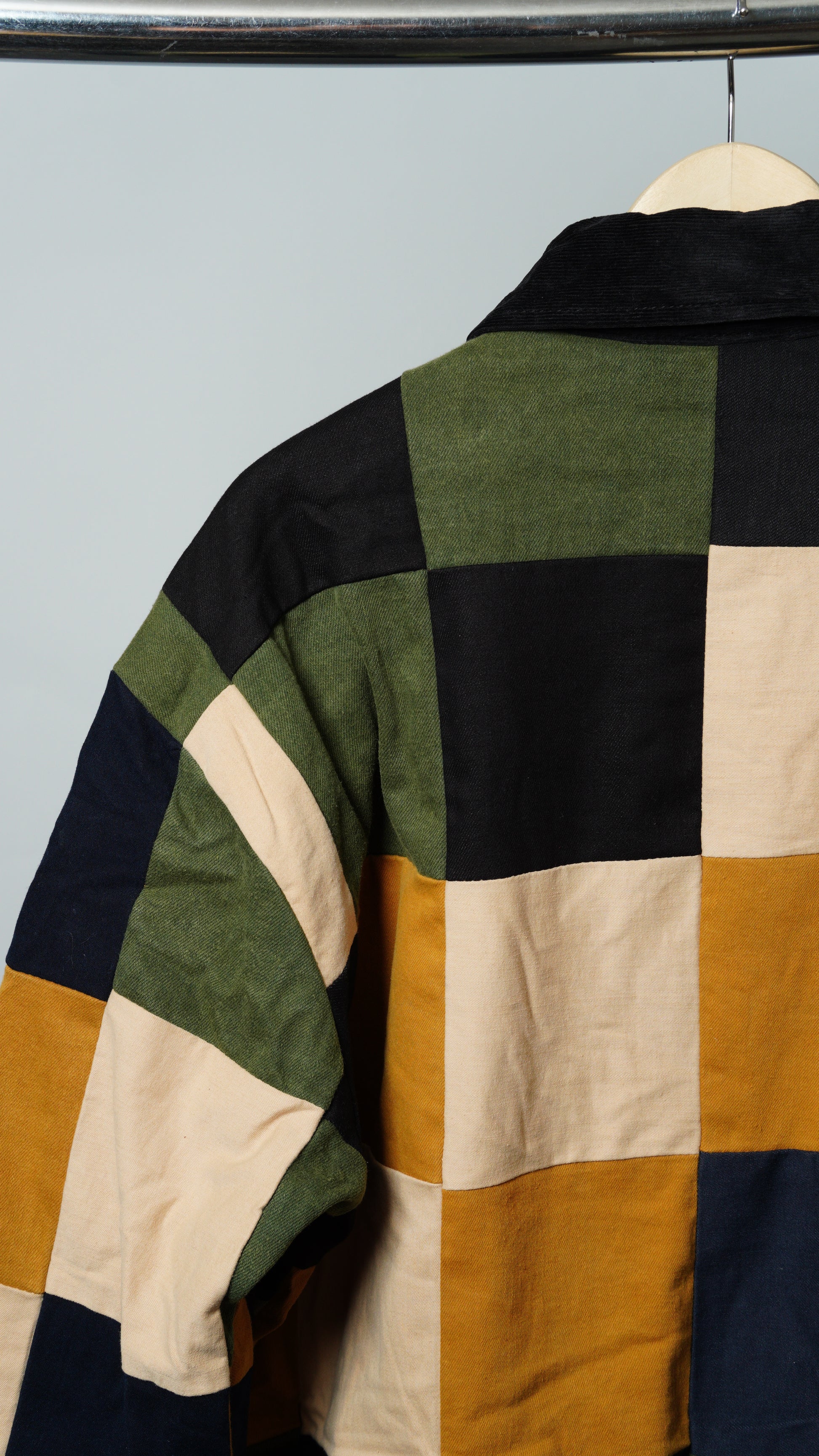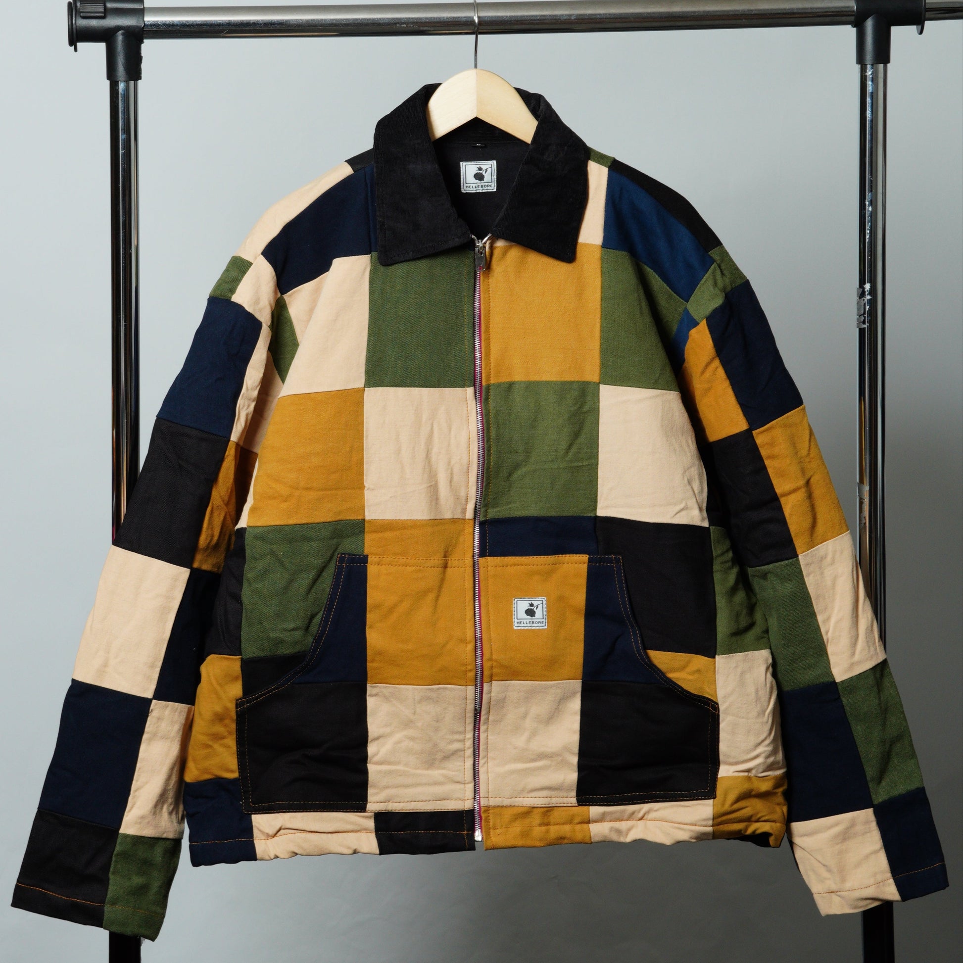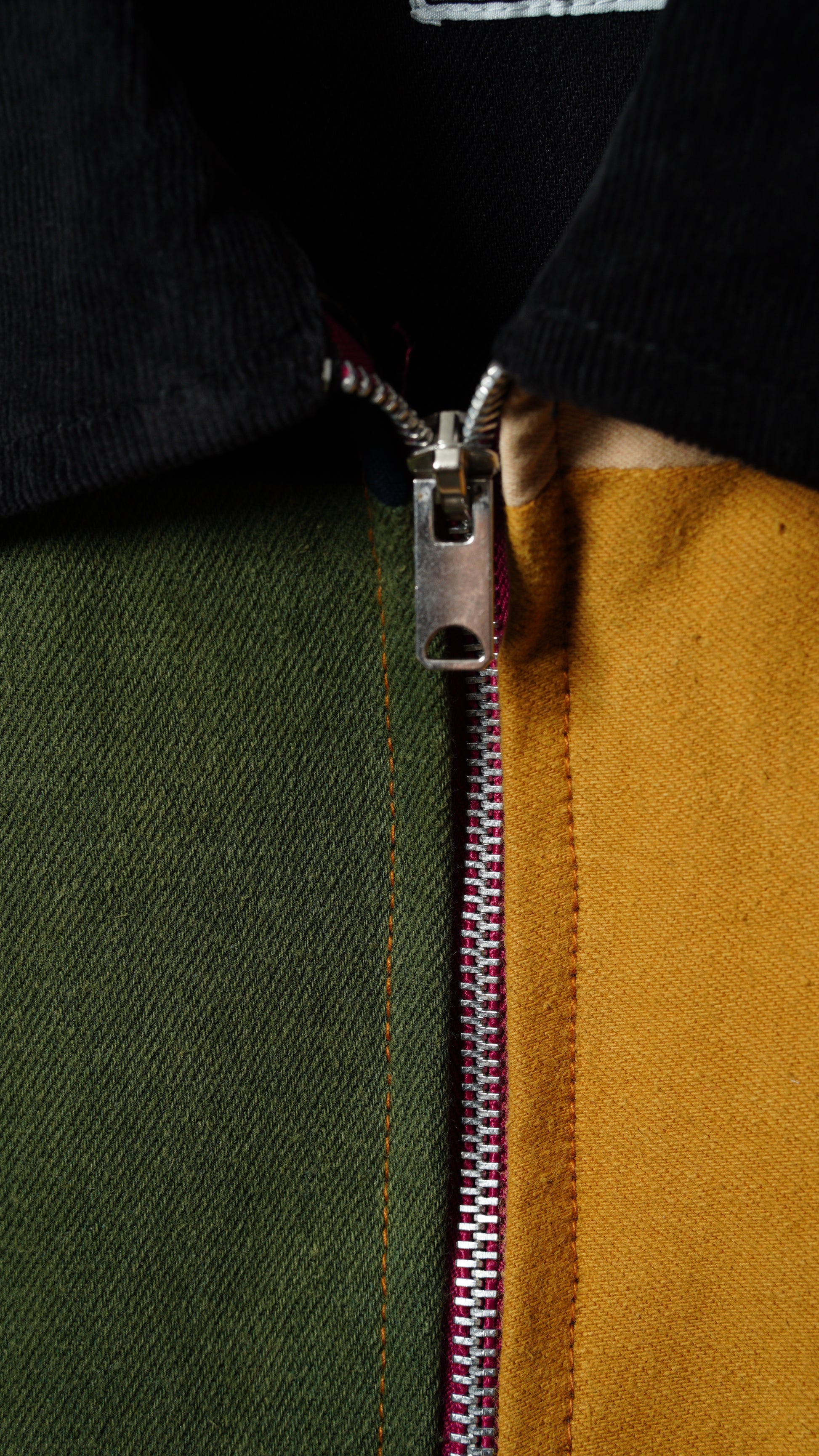 These jackets are made from rag-house sourced work apparel scraps and preowned garments. Each jacket is unique with various color combinations and cloth linings. Linings and trims are taken from other second-hand materials and brands.
