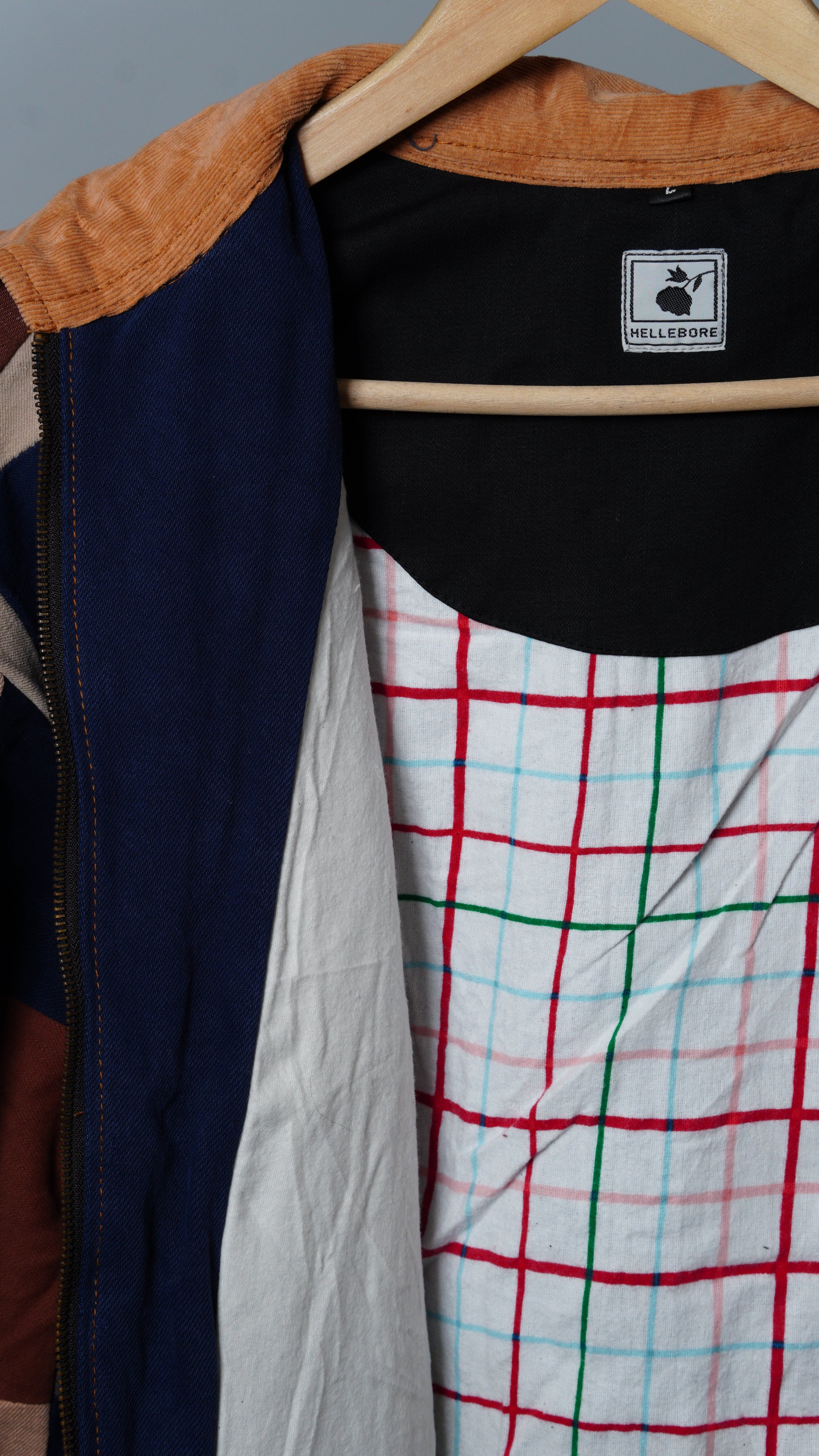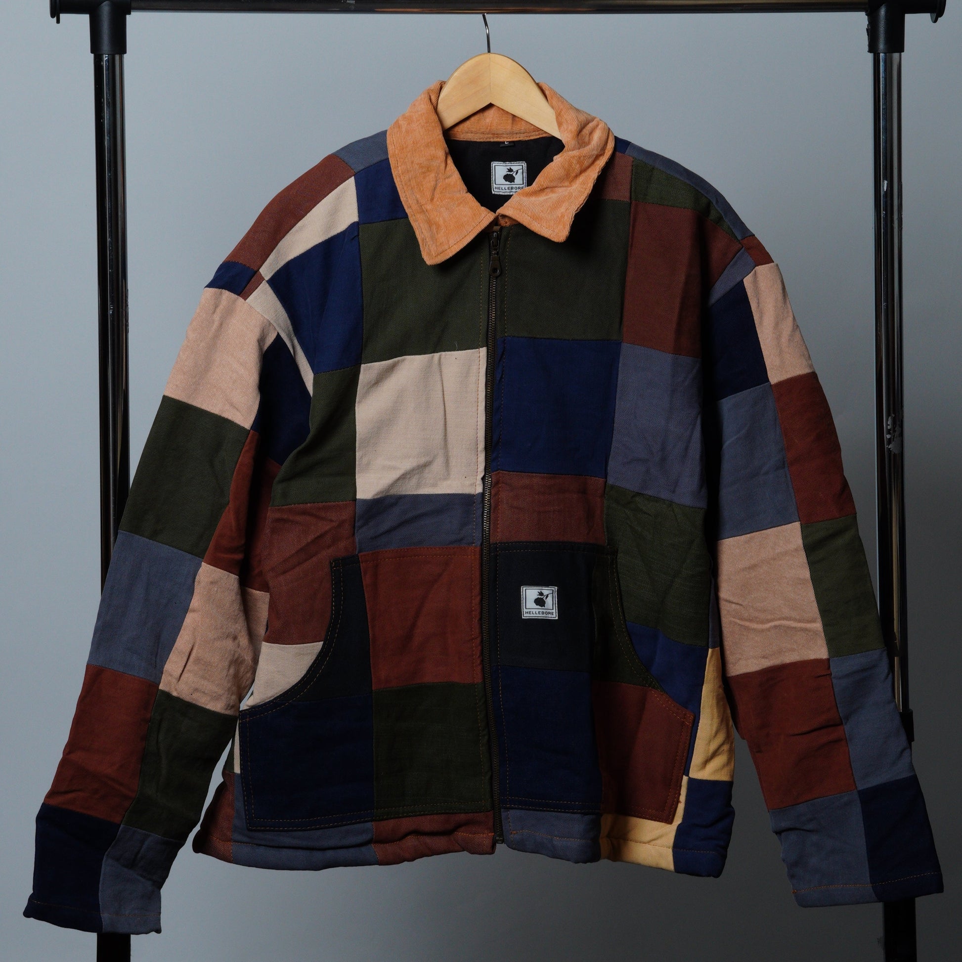 These jackets are made from soft work apparel scraps and preowned garments. Each jacket is unique with various color combinations and cloth linings. Linings and trims are taken from other second-hand materials and brands.