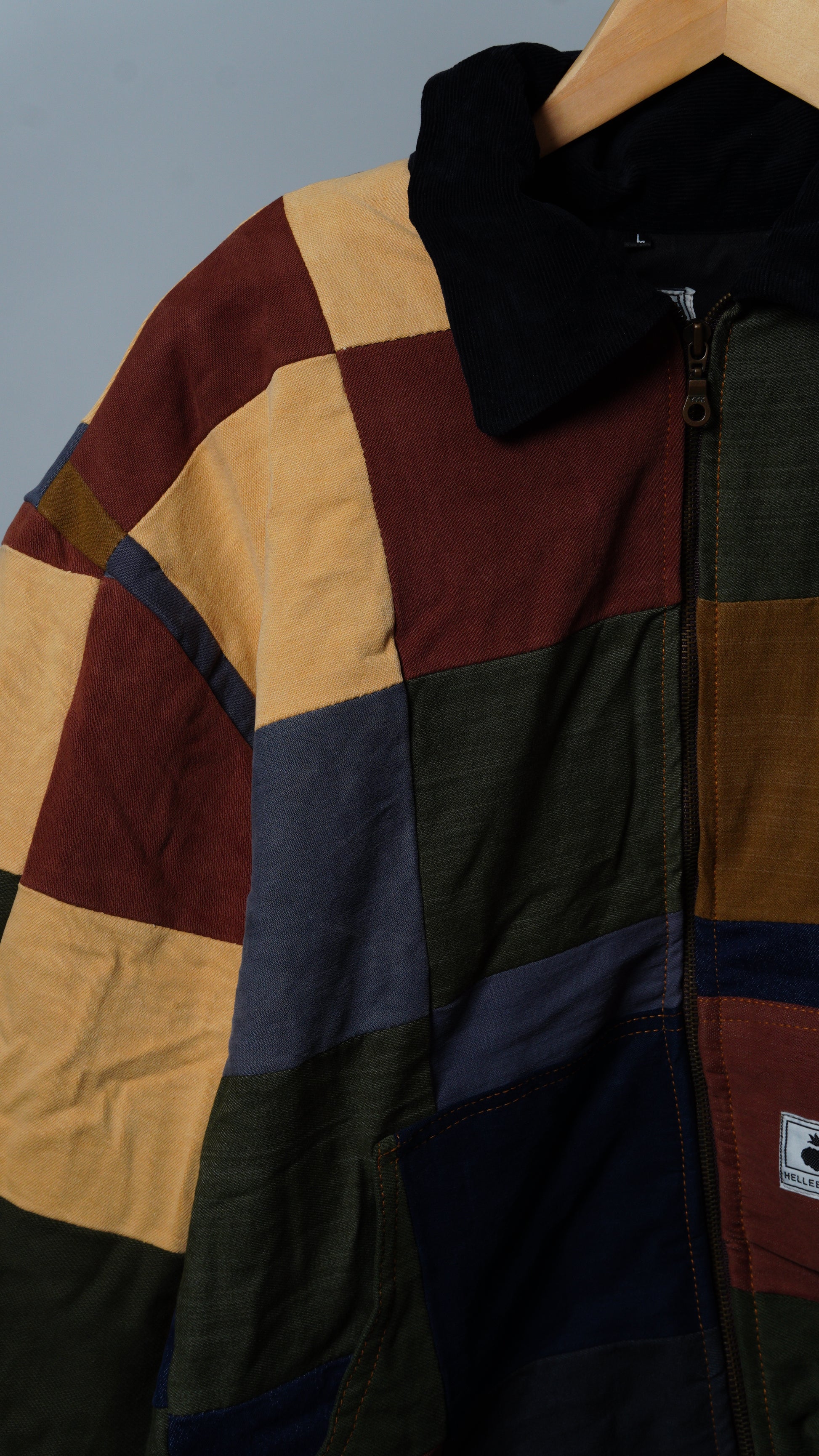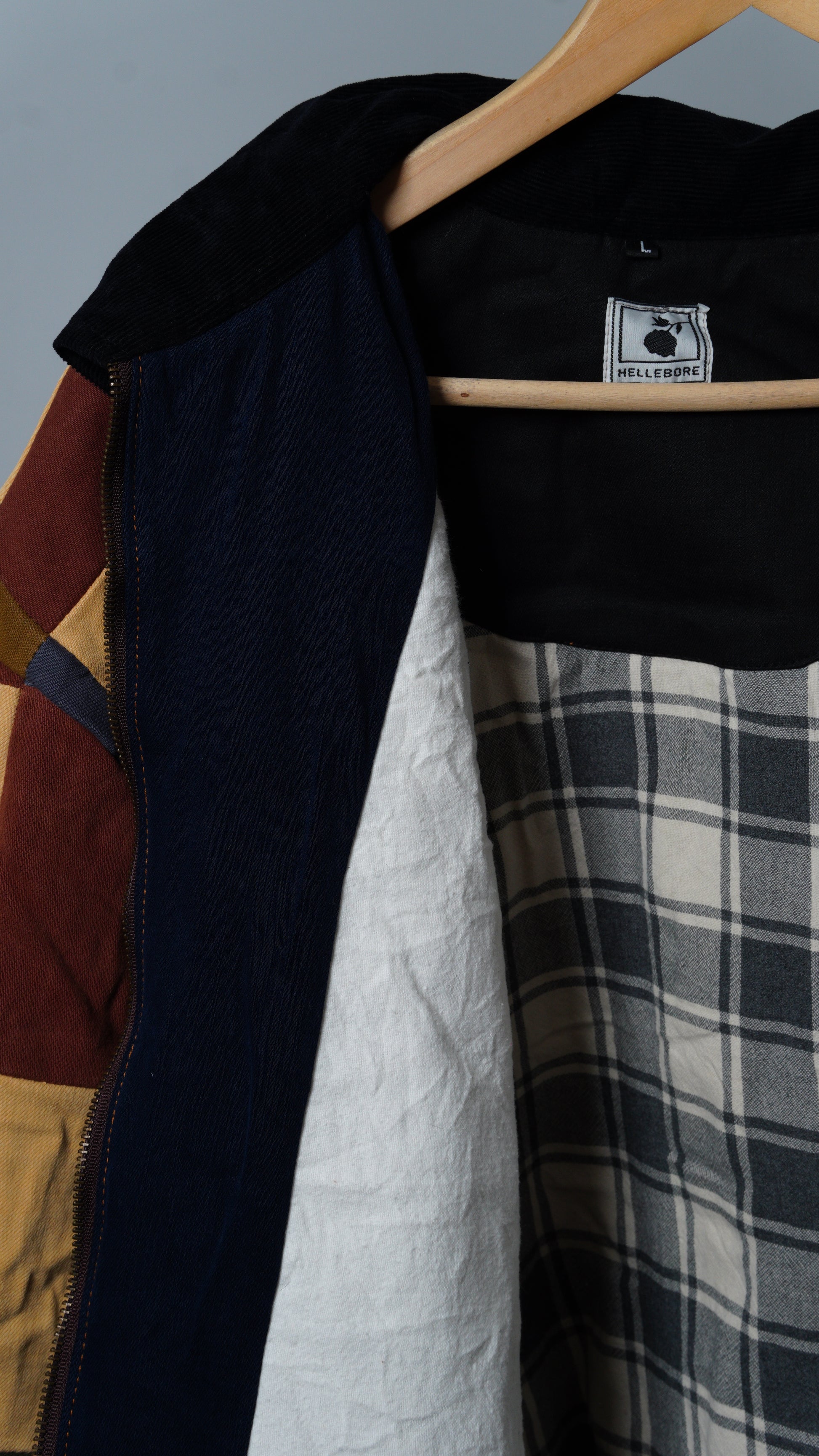 These jackets are made from soft work apparel scraps and preowned garments. Each jacket is unique with various color combinations and cloth linings. Linings and trims are taken from other second-hand materials and brands.