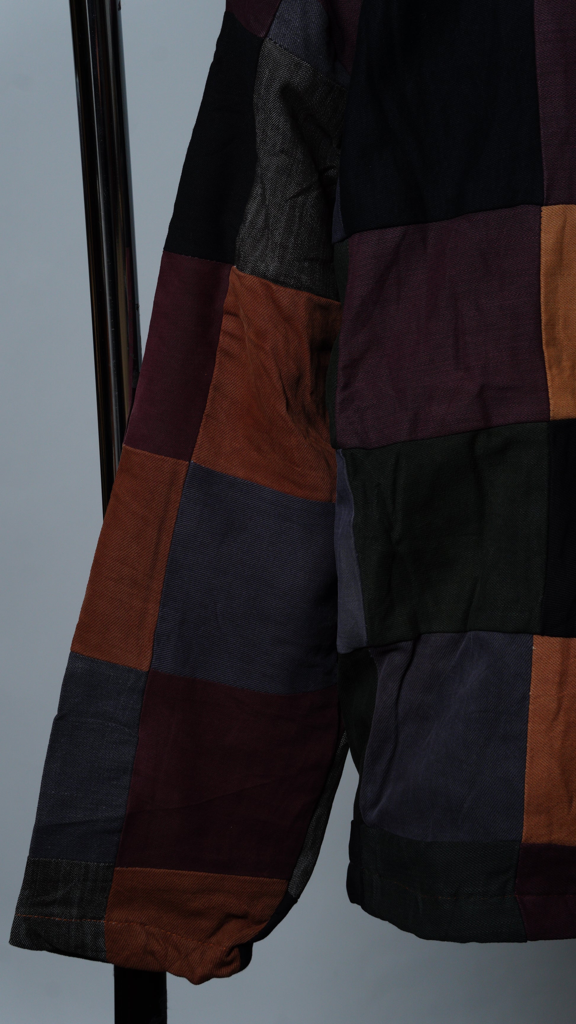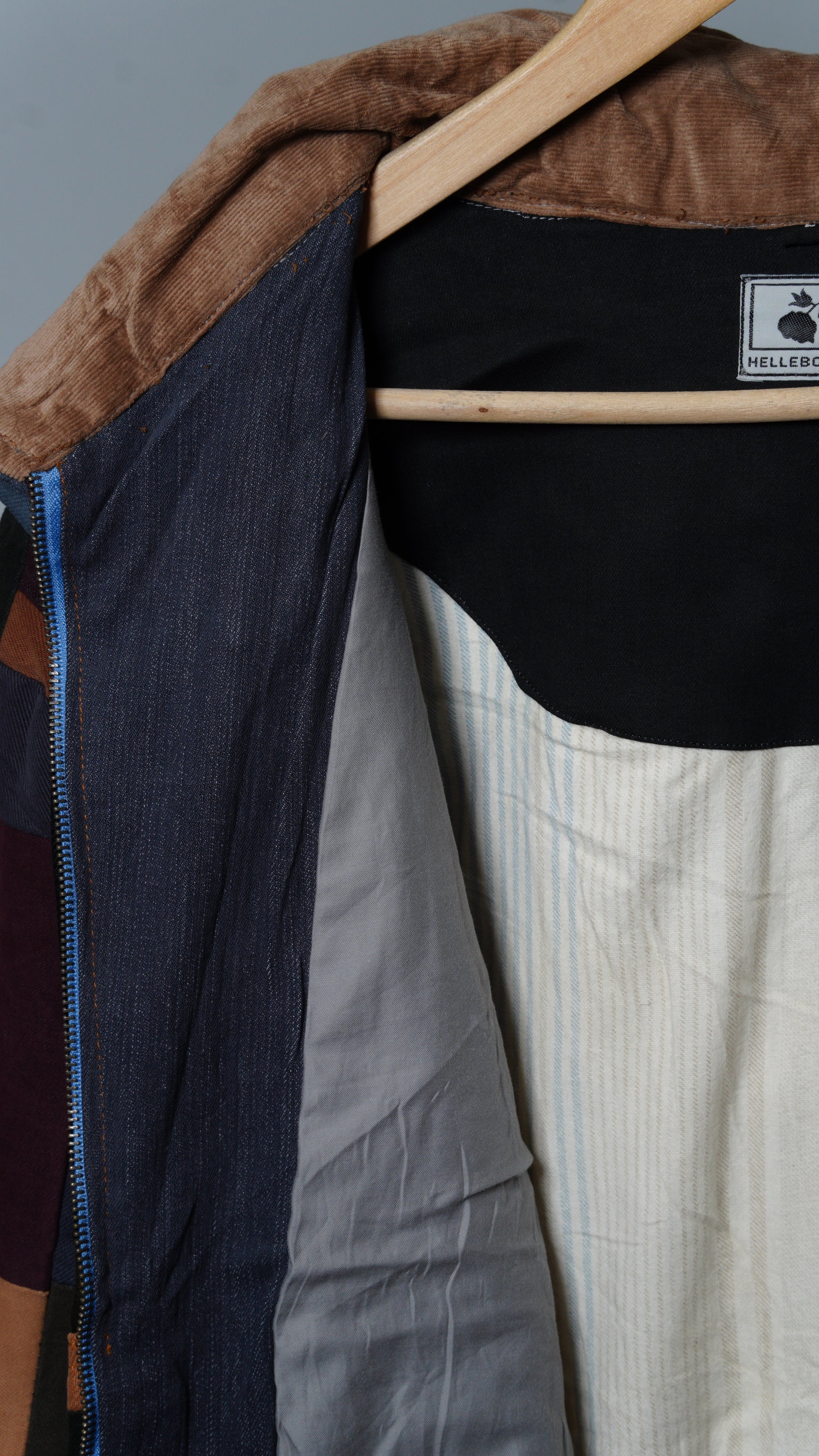 These jackets are made from soft work apparel scraps and preowned garments. Each jacket is unique with various color combinations and cloth linings. Linings and trims are taken from other second-hand materials and brands.
