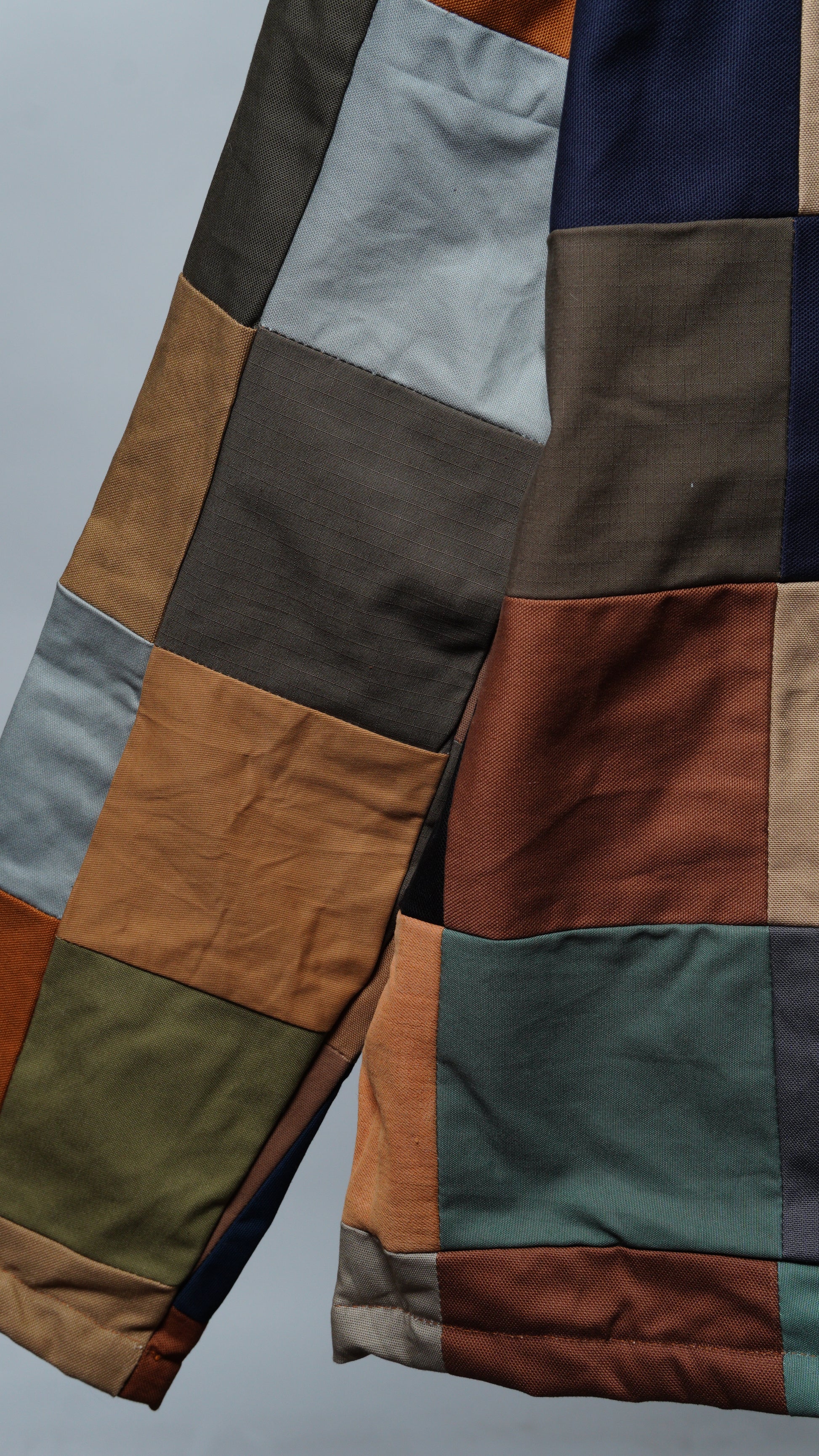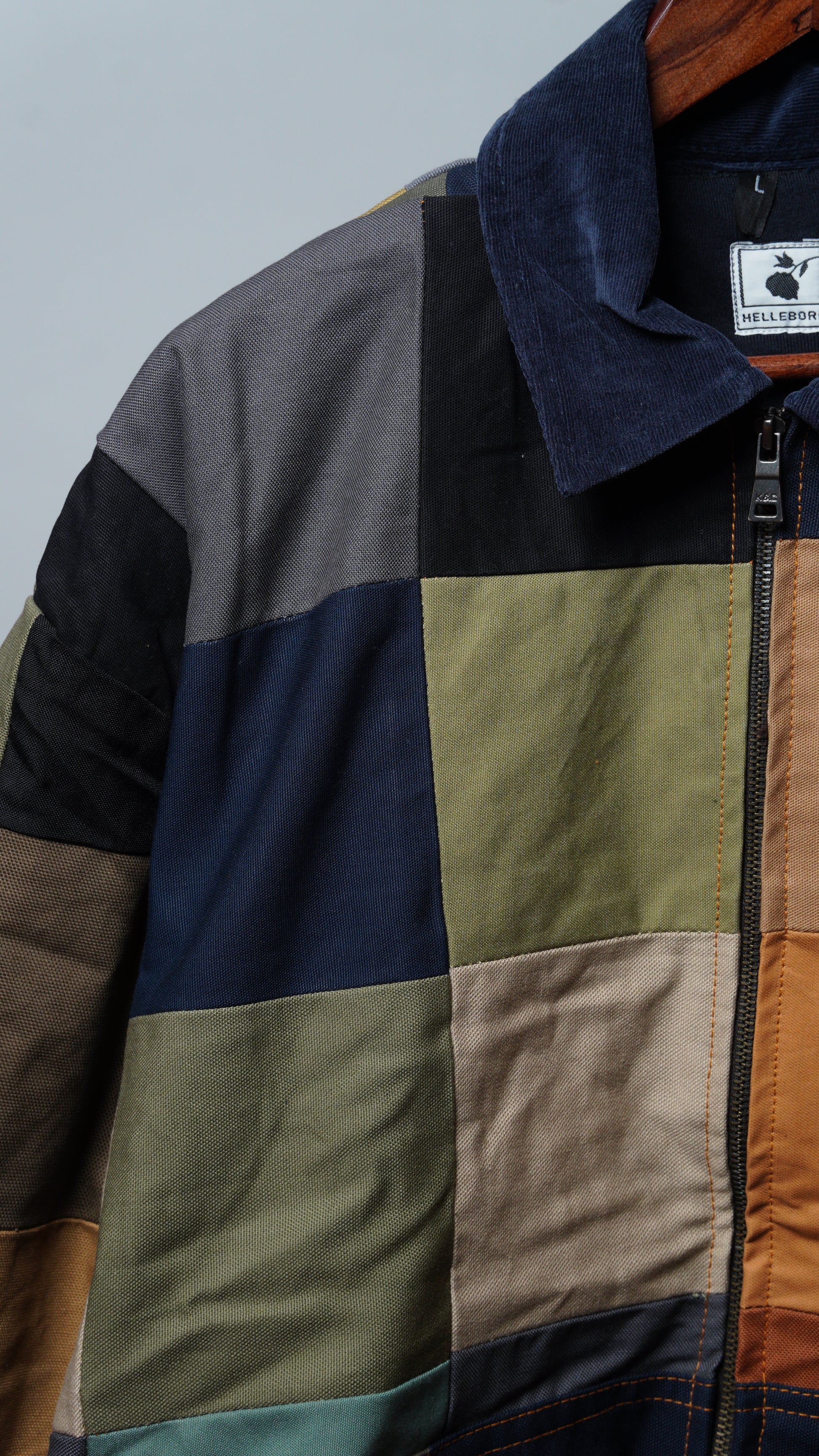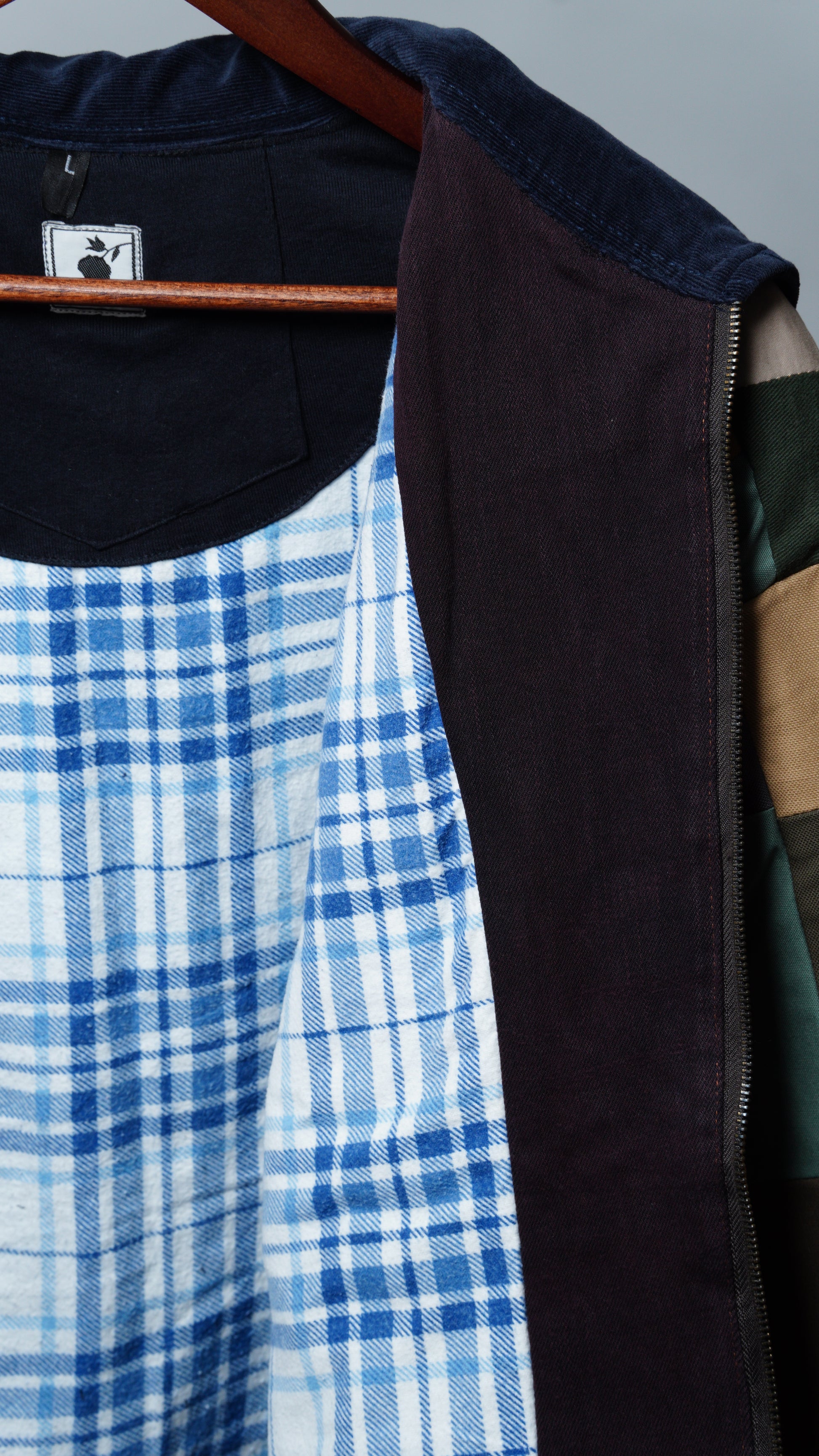 These jackets are made from soft work apparel scraps and preowned garments. Each jacket is unique with various color combinations and cloth linings. Linings and trims are taken from other second-hand materials and brands.