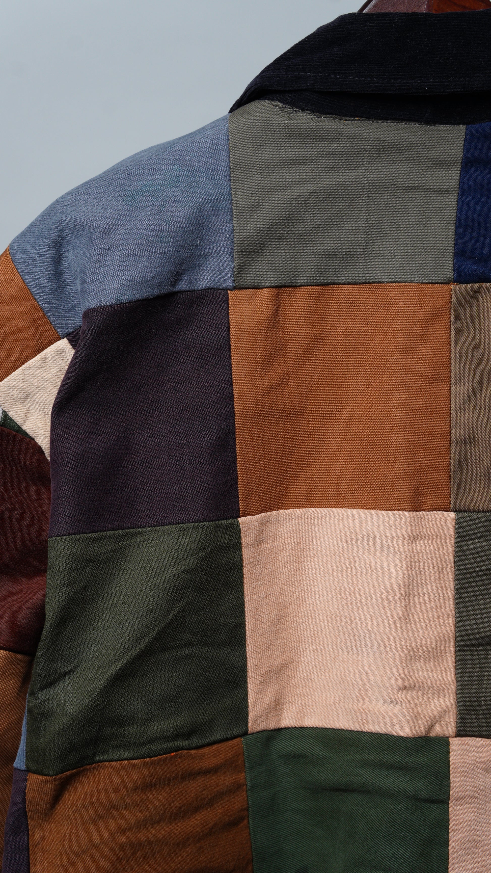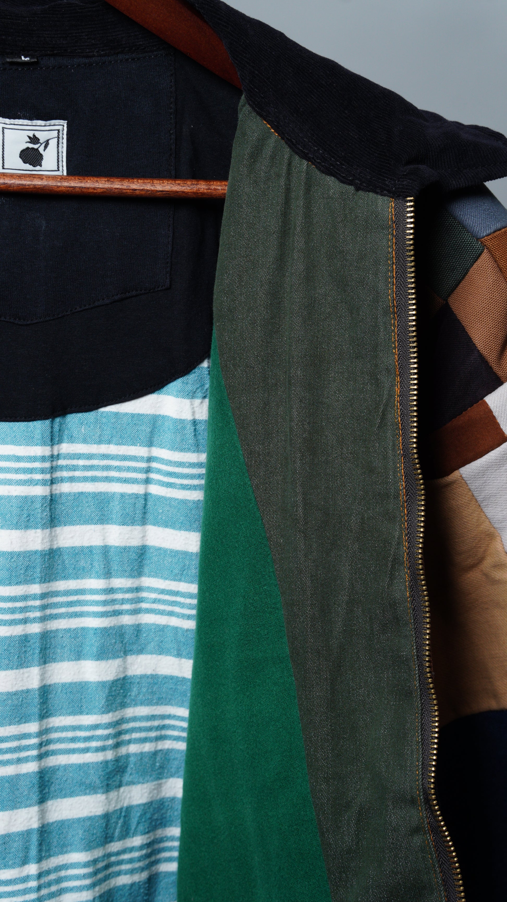 These jackets are made from soft work apparel scraps and preowned garments. Each jacket is unique with various color combinations and cloth linings. Linings and trims are taken from other second-hand materials and brands.