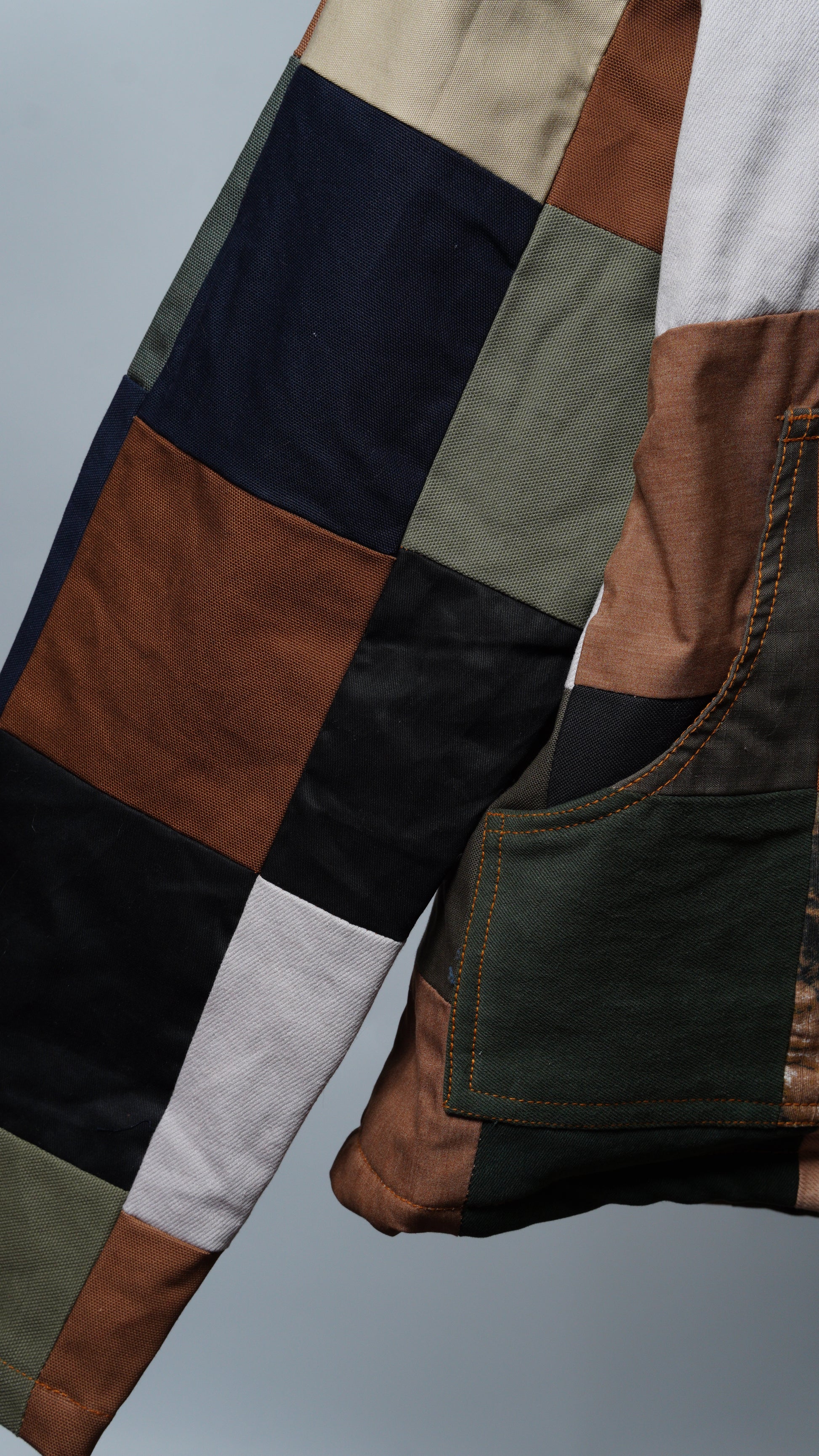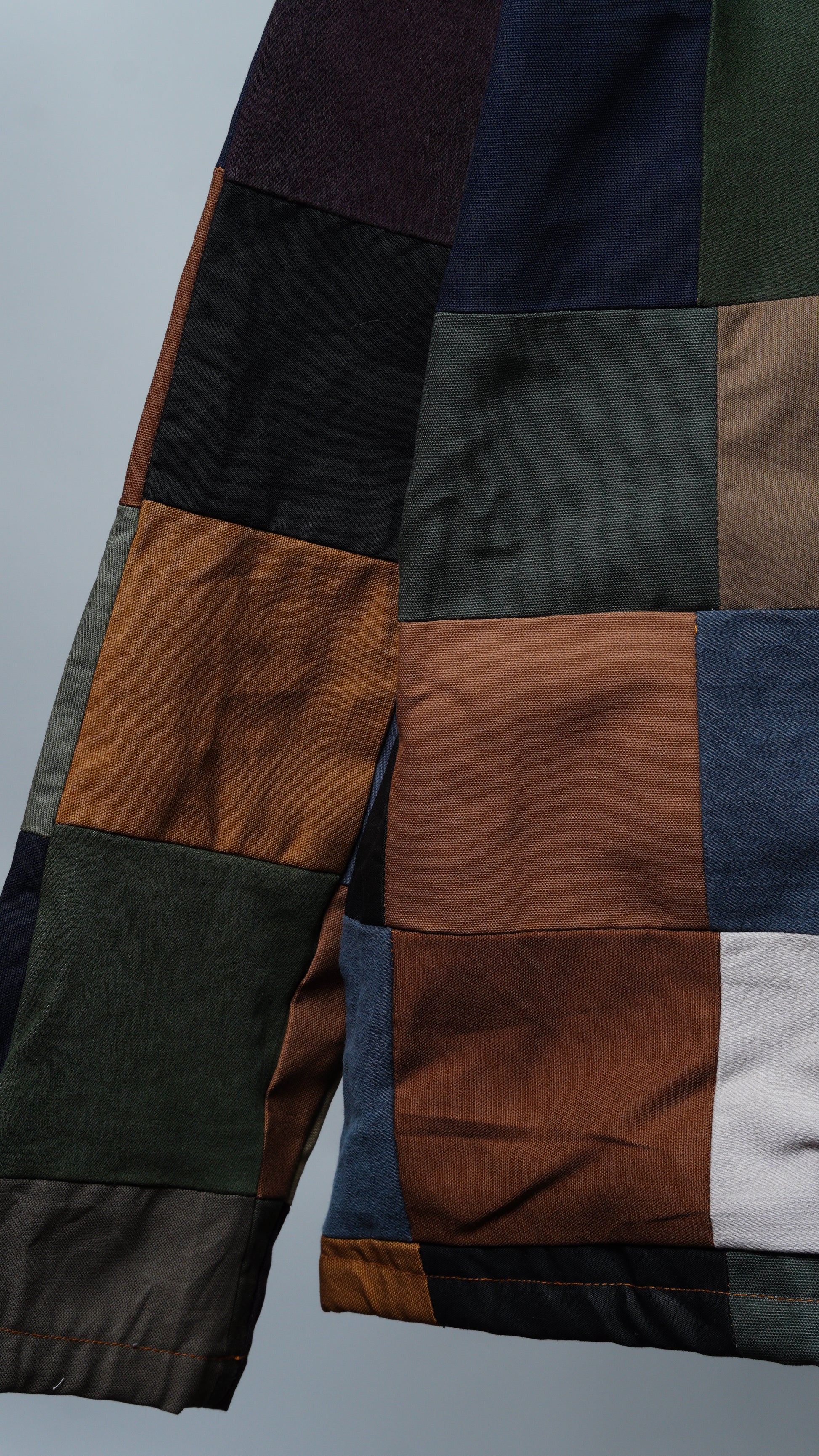 These jackets are made from soft work apparel scraps and preowned garments. Each jacket is unique with various color combinations and cloth linings. Linings and trims are taken from other second-hand materials and brands.