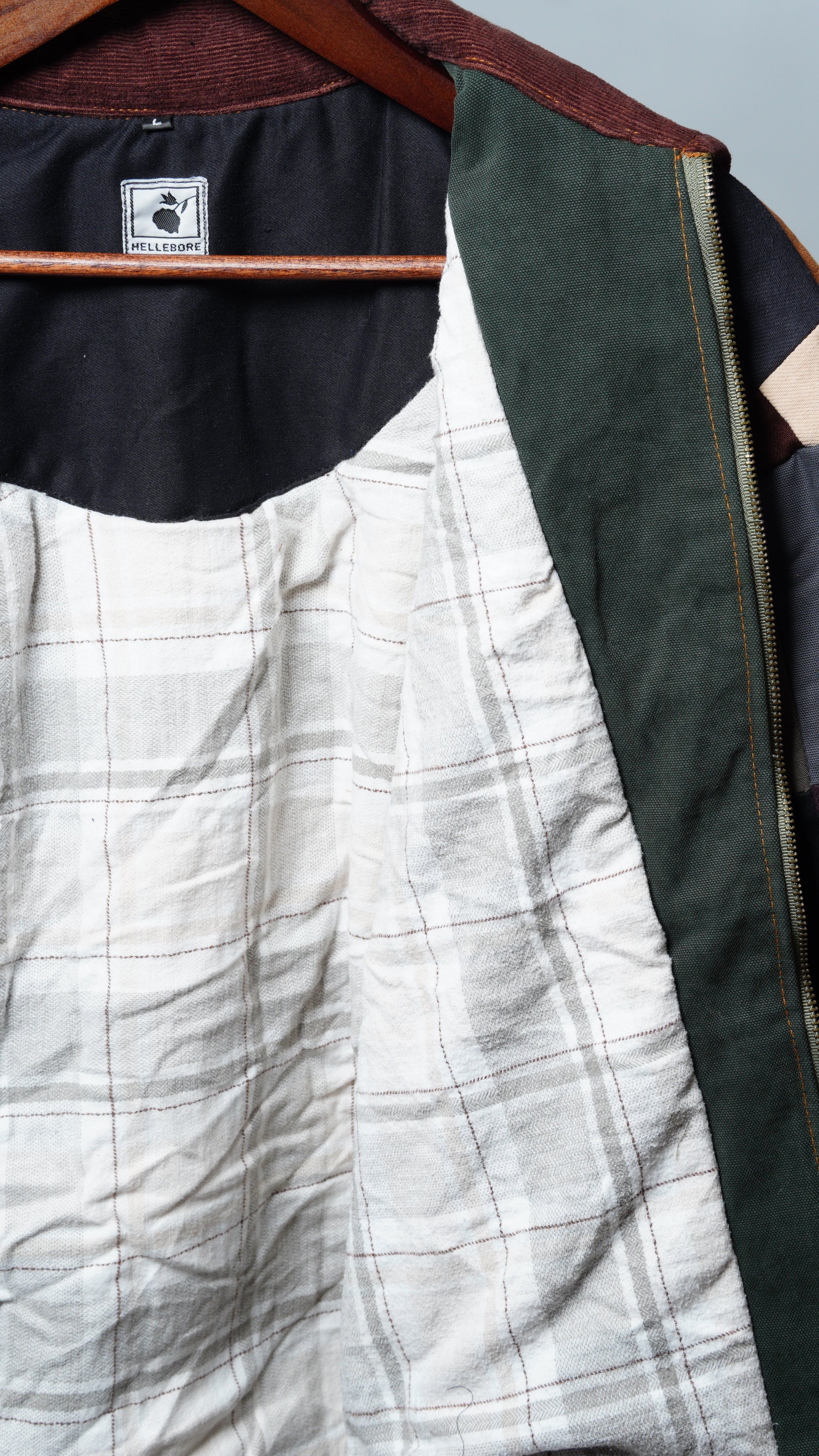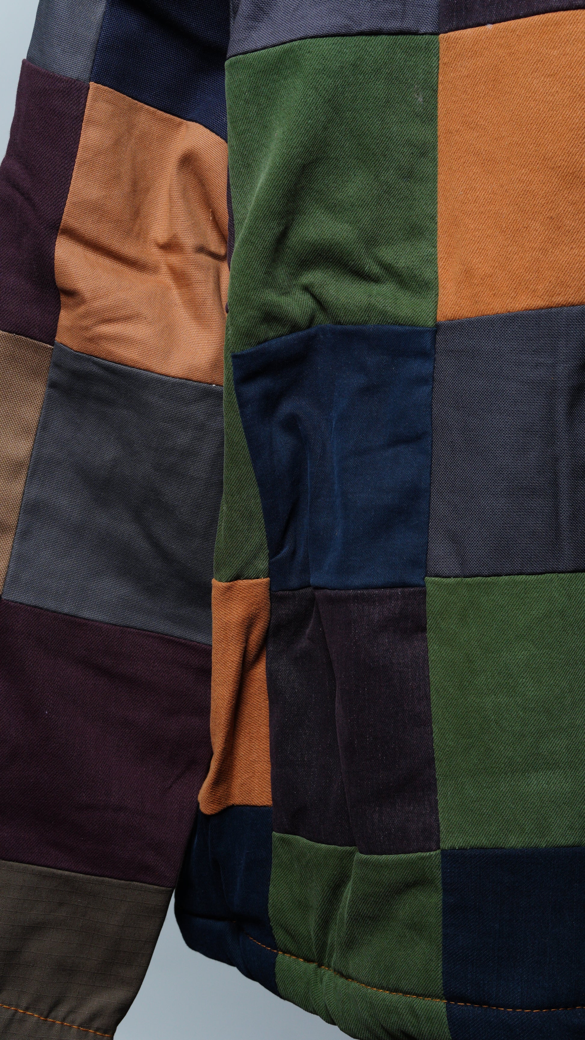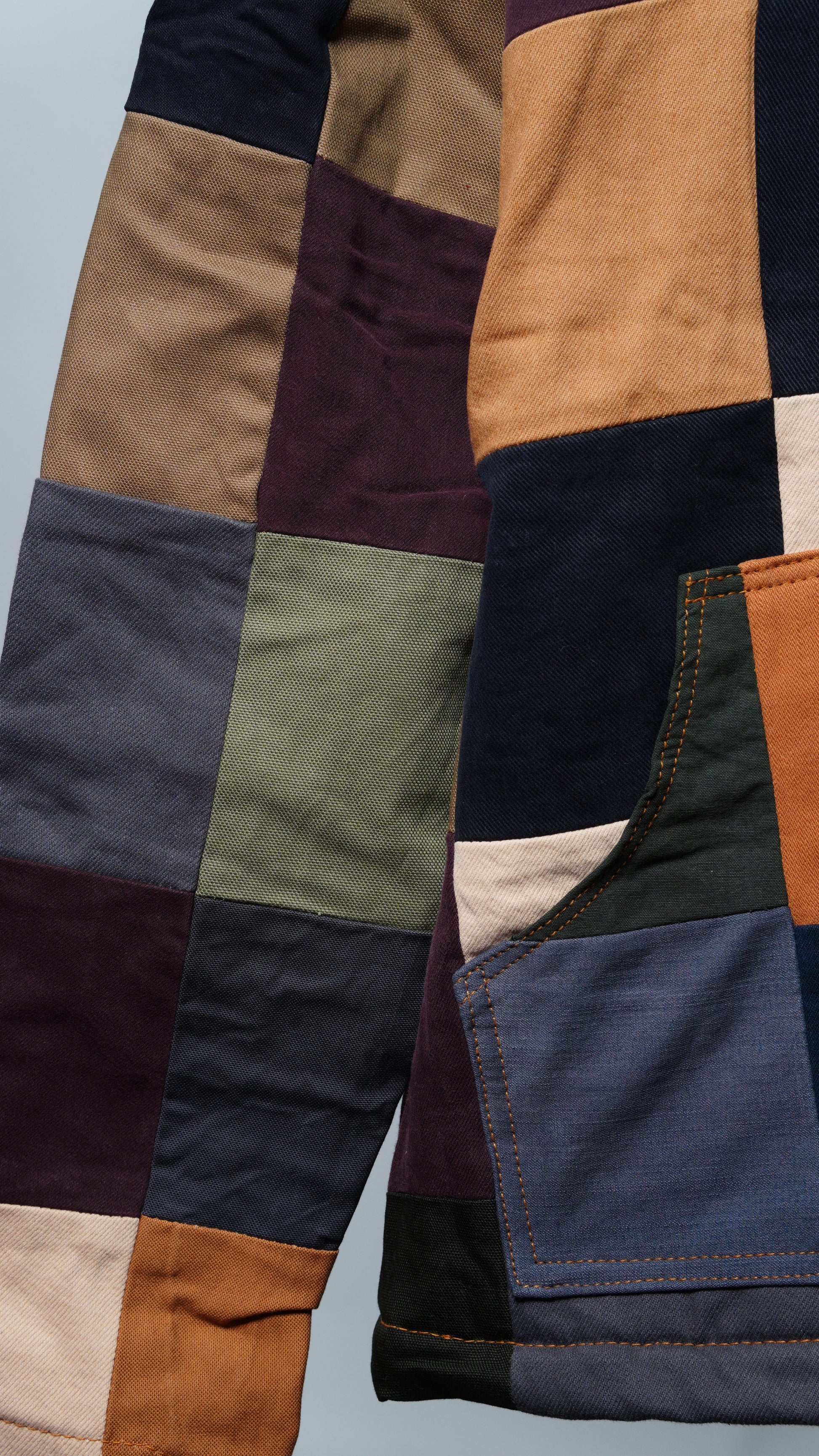 These jackets are made from soft work apparel scraps and preowned garments. Each jacket is unique with various color combinations and cloth linings. Linings and trims are taken from other second-hand materials and brands.