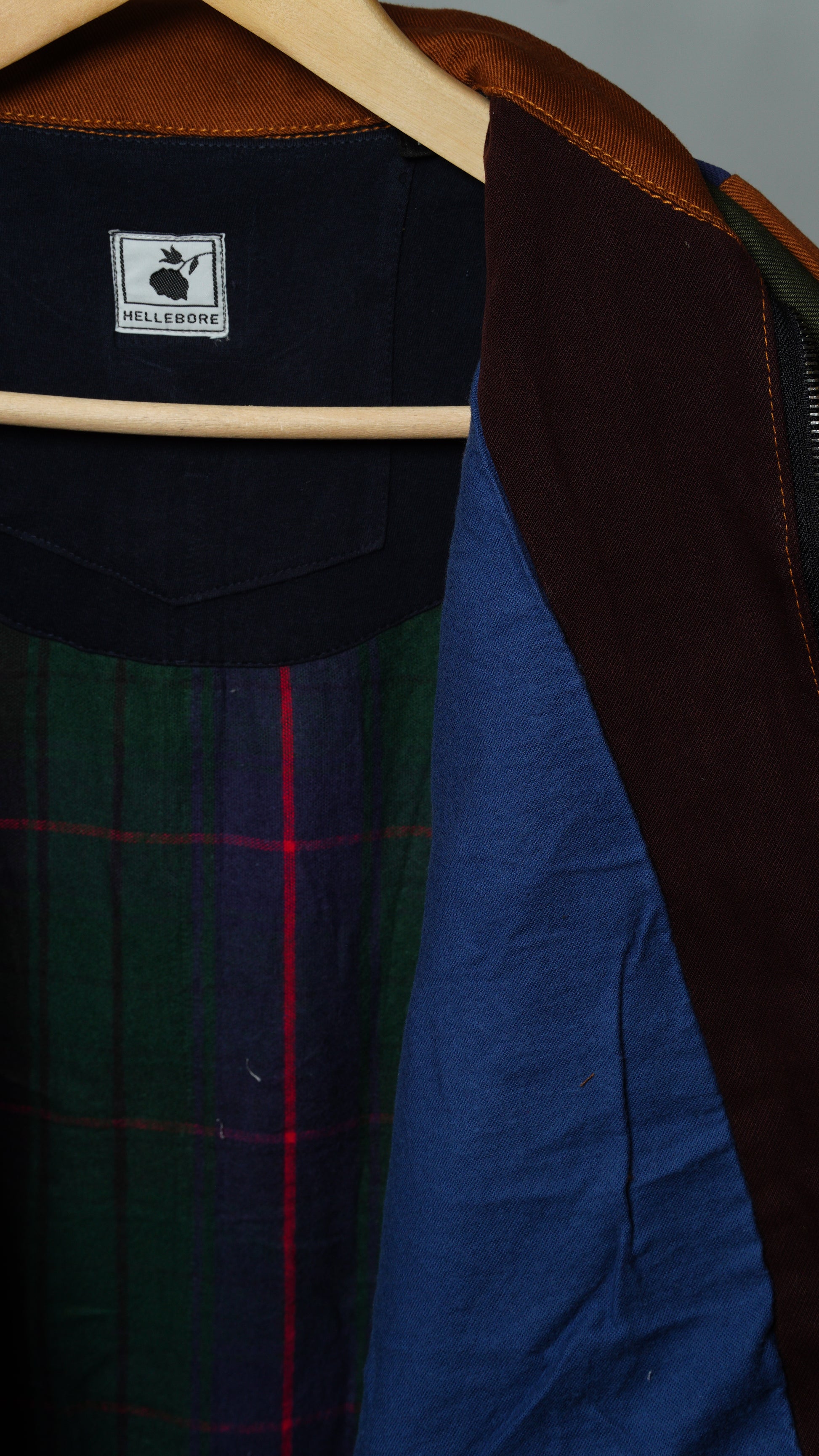 These jackets are made from soft work apparel scraps and preowned garments. Each jacket is unique with various color combinations and cloth linings. Linings and trims are taken from other second-hand materials and brands.