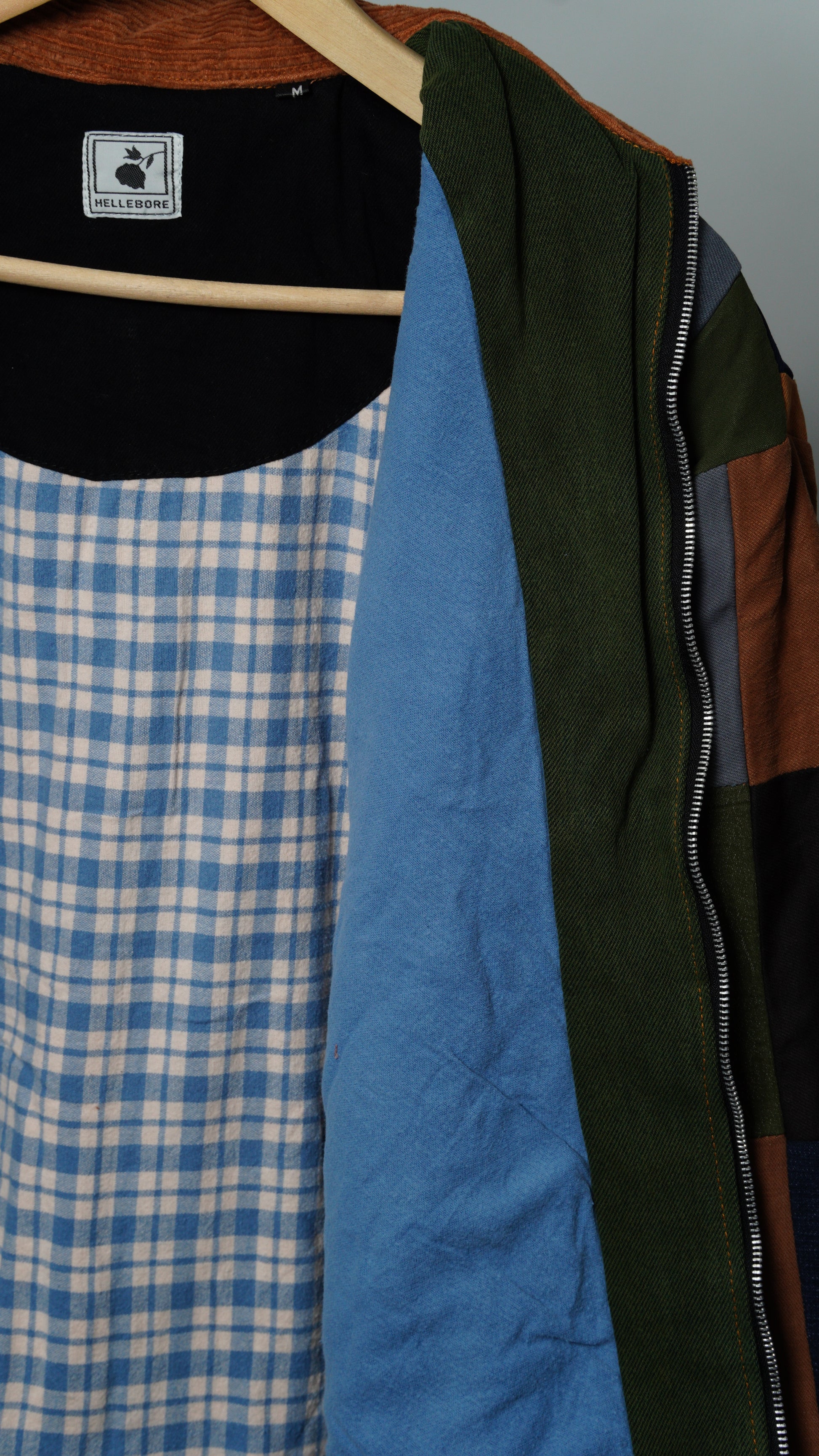 These jackets are made from soft work apparel scraps and preowned garments. Each jacket is unique with various color combinations and cloth linings. Linings and trims are taken from other second-hand materials and brands.