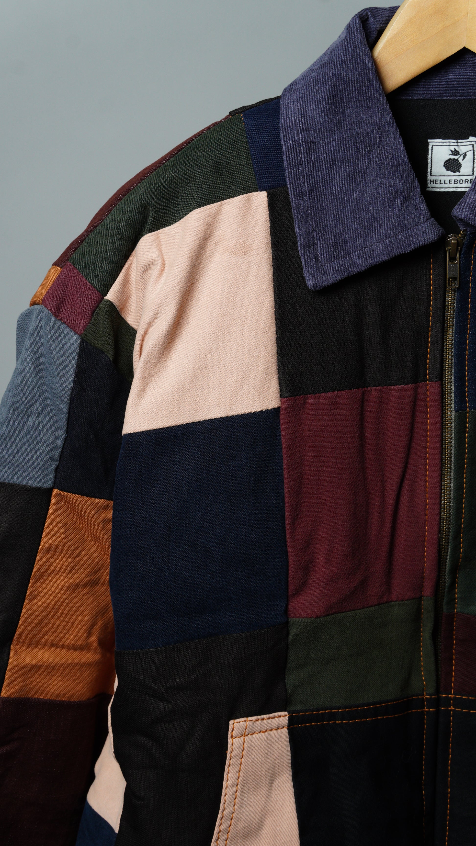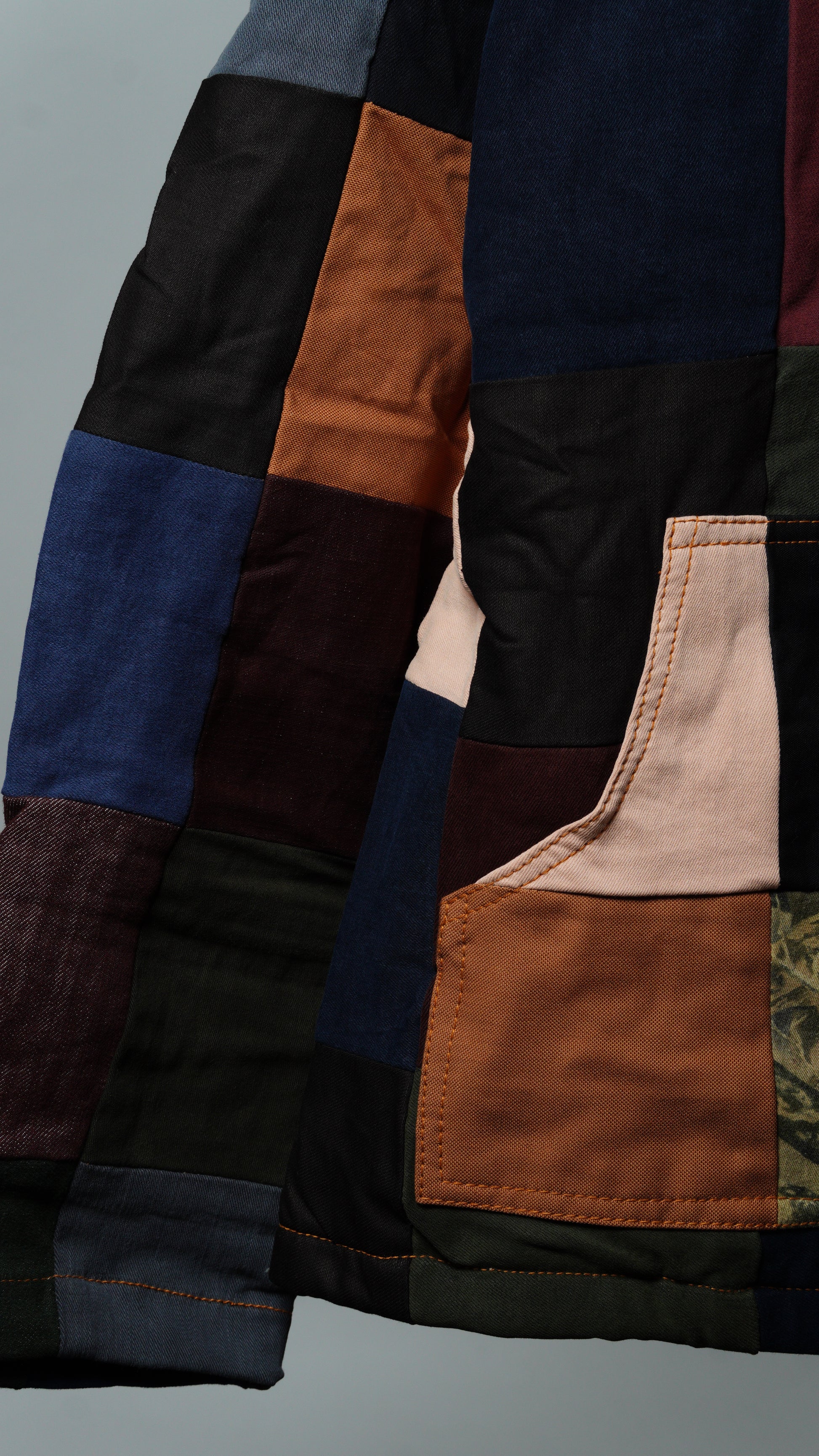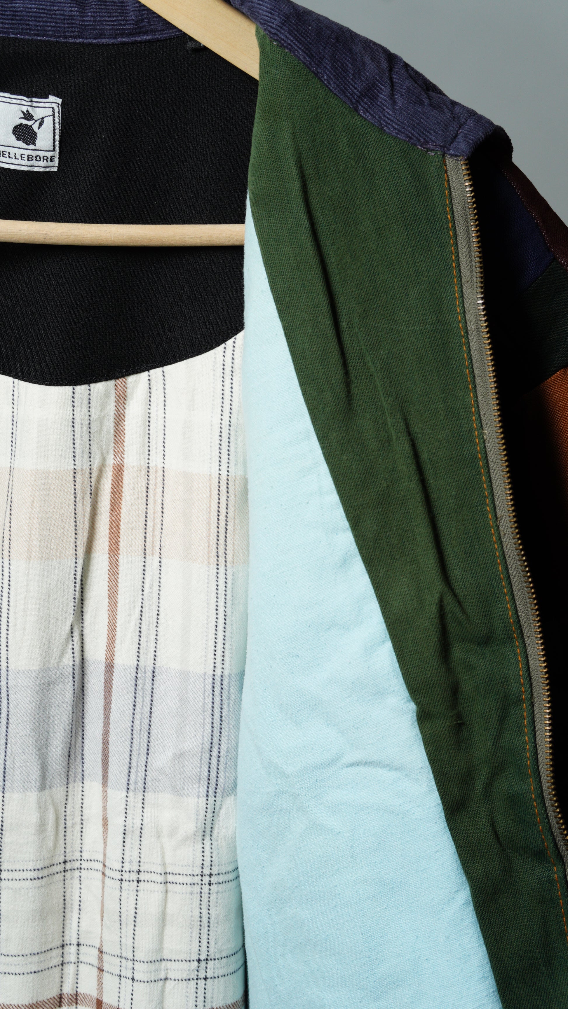 These jackets are made from soft work apparel scraps and preowned garments. Each jacket is unique with various color combinations and cloth linings. Linings and trims are taken from other second-hand materials and brands.