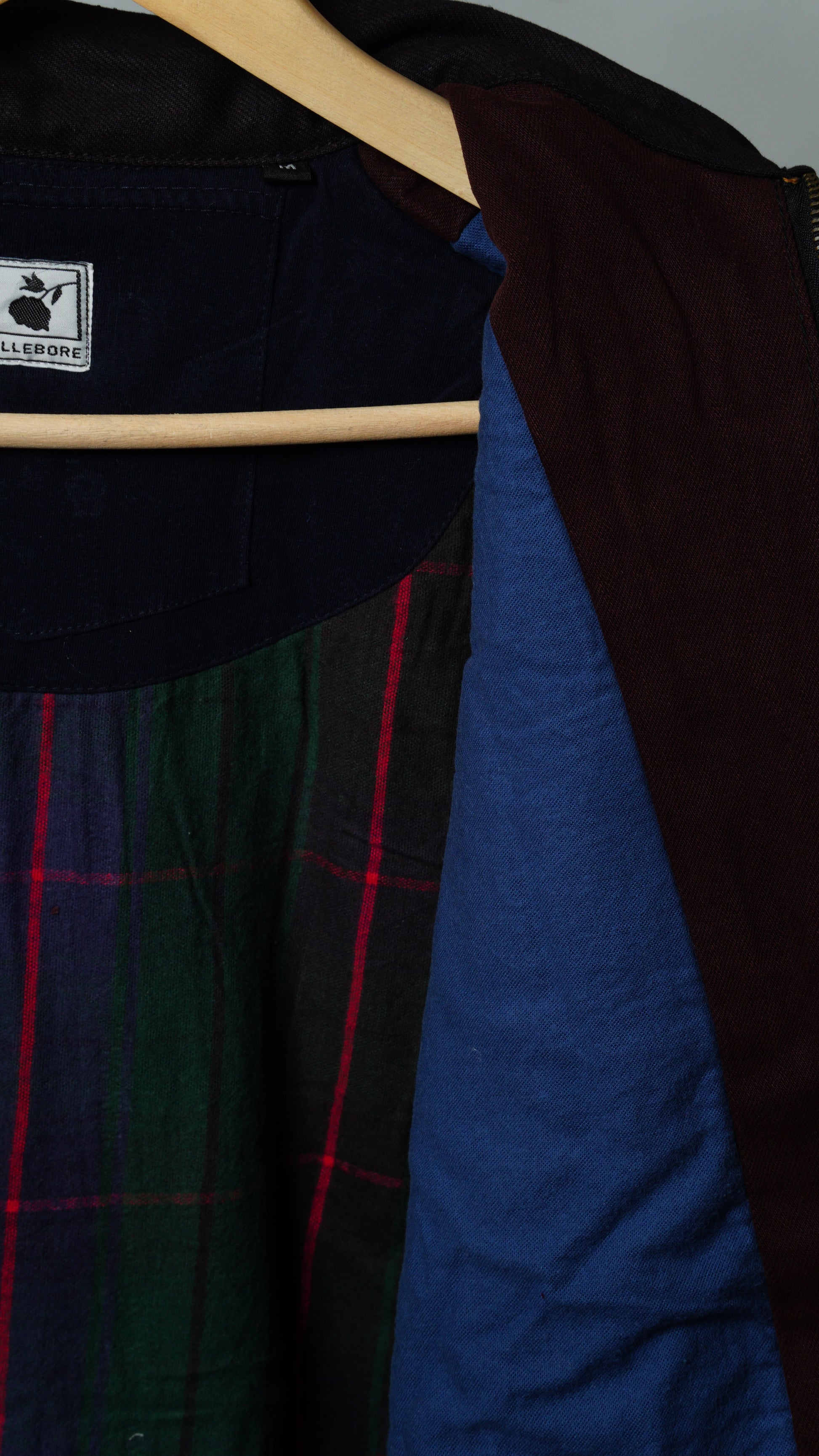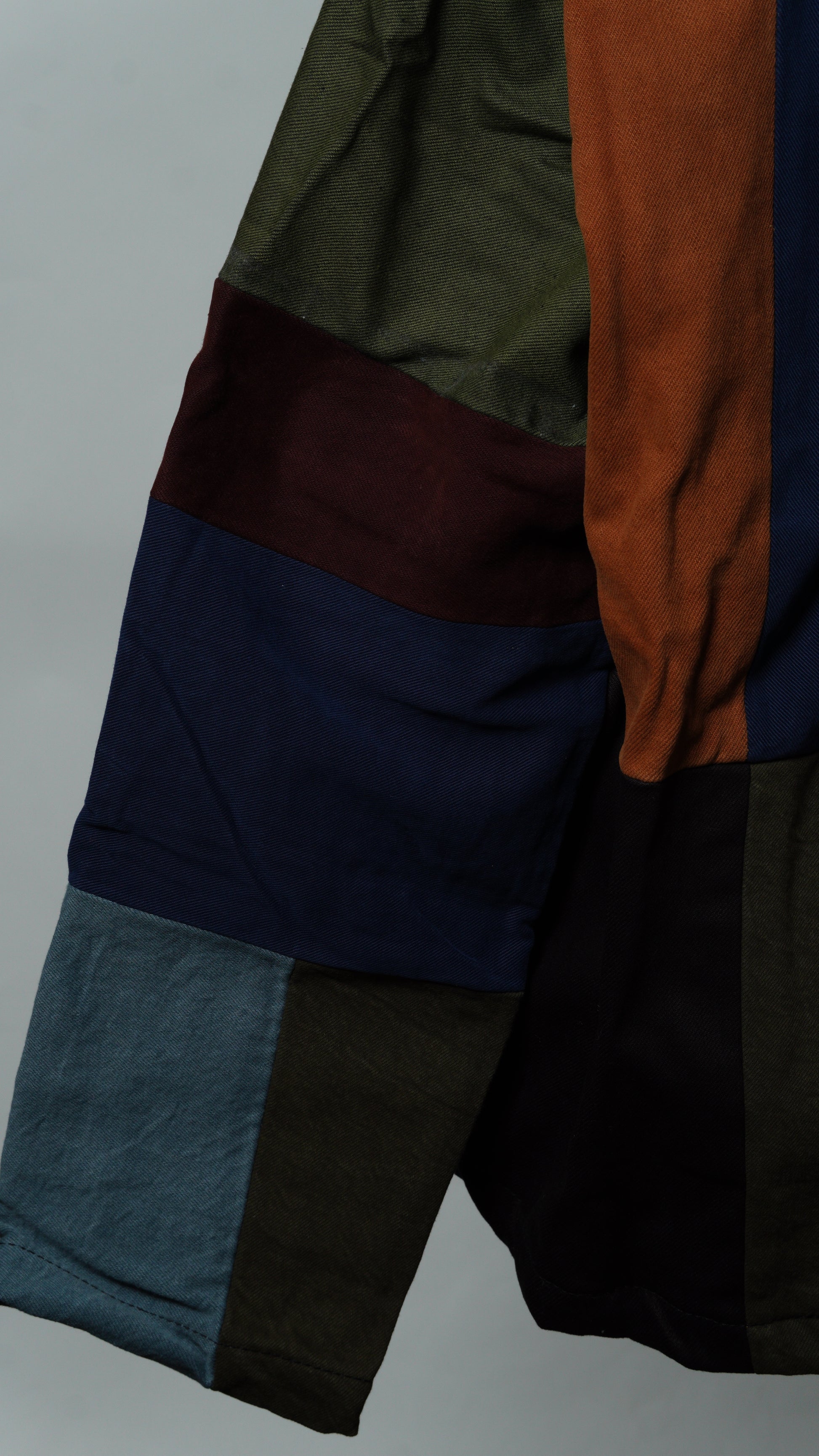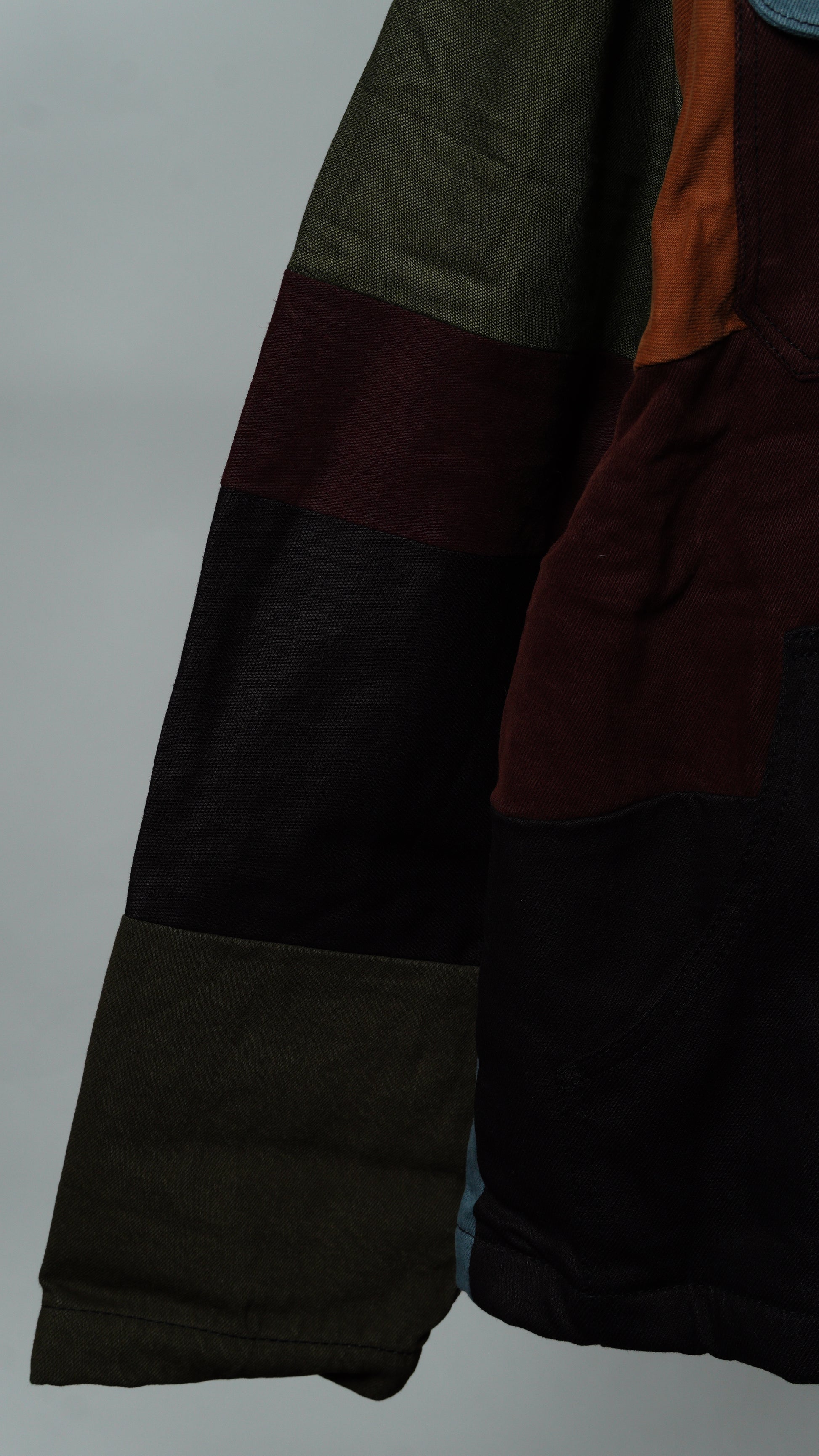These jackets are made from soft work apparel scraps and preowned garments. Each jacket is unique with various color combinations and cloth linings. Linings and trims are taken from other second-hand materials and brands.