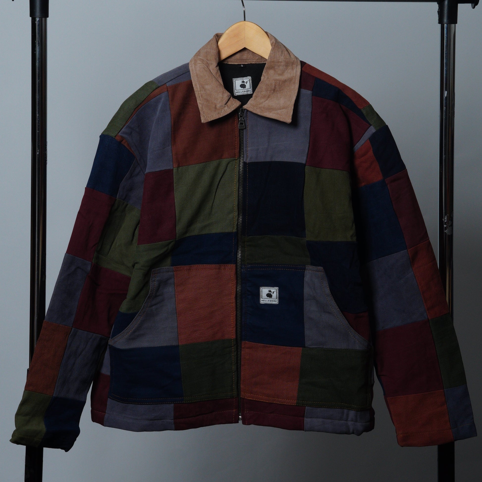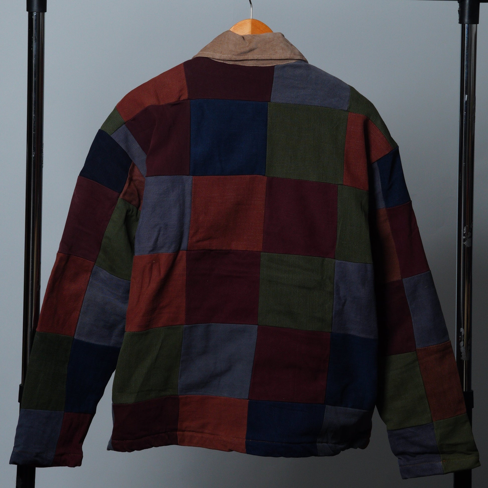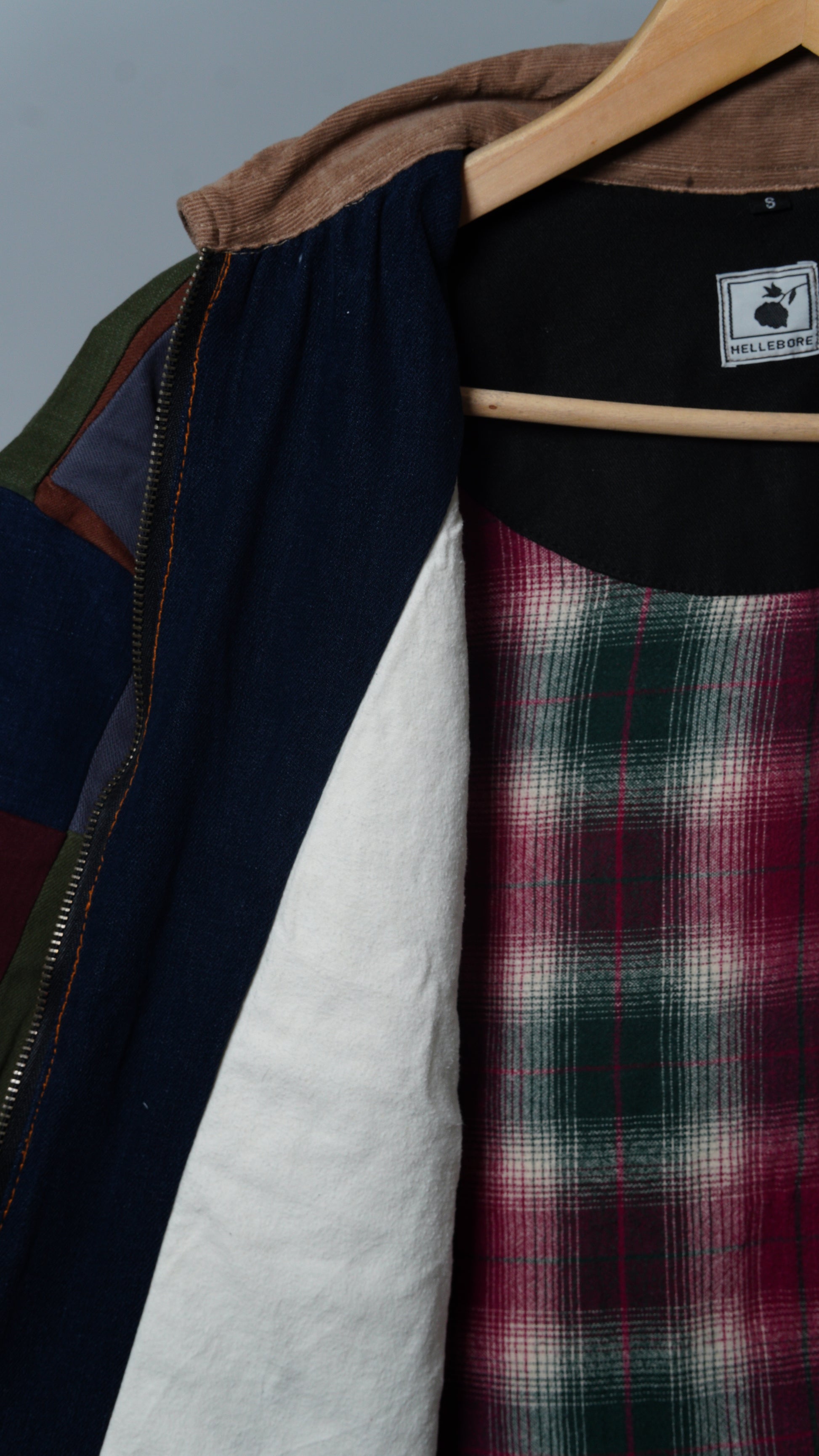These jackets are made from soft work apparel scraps and preowned garments. Each jacket is unique with various color combinations and cloth linings. Linings and trims are taken from other second-hand materials and brands.