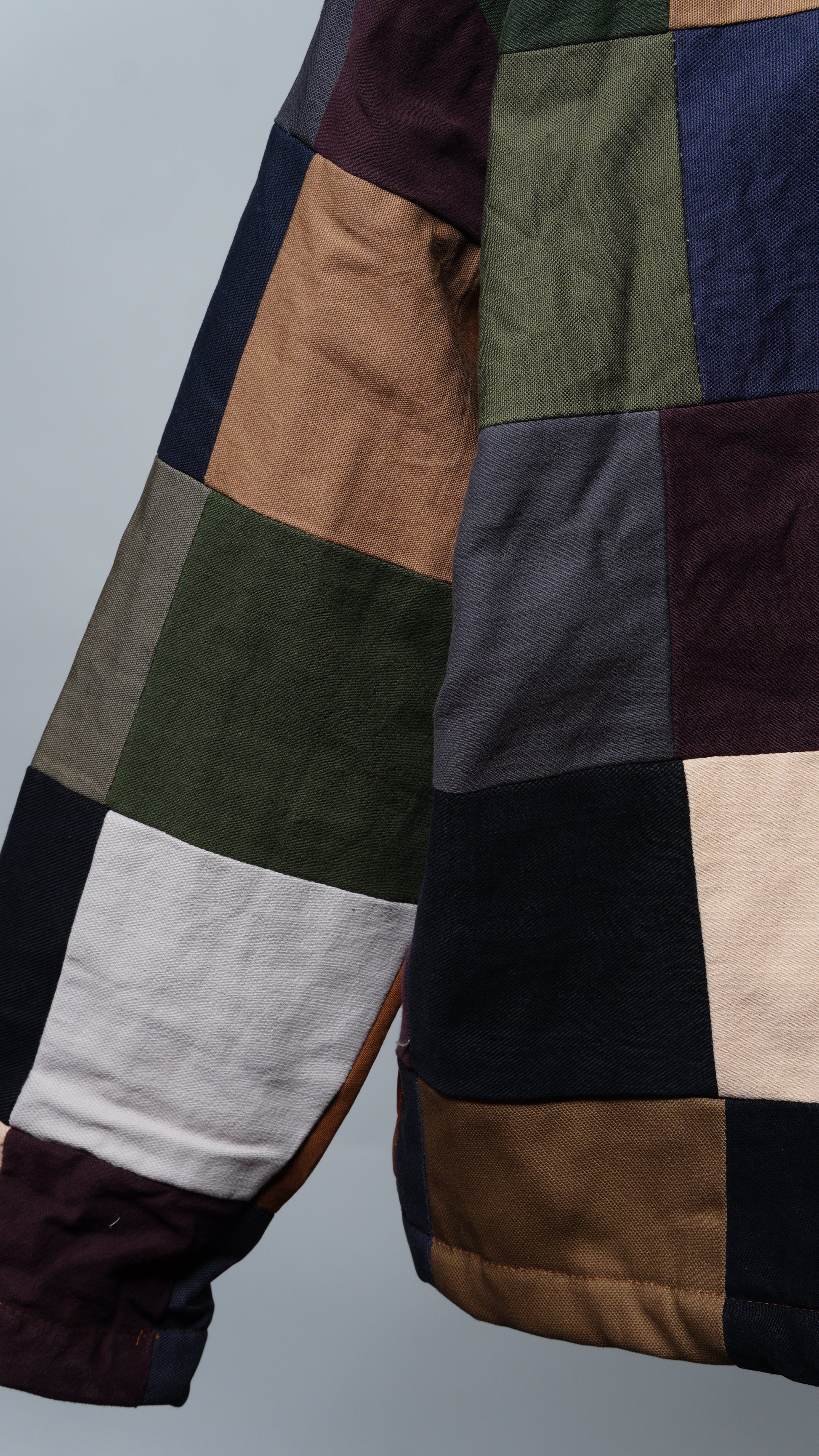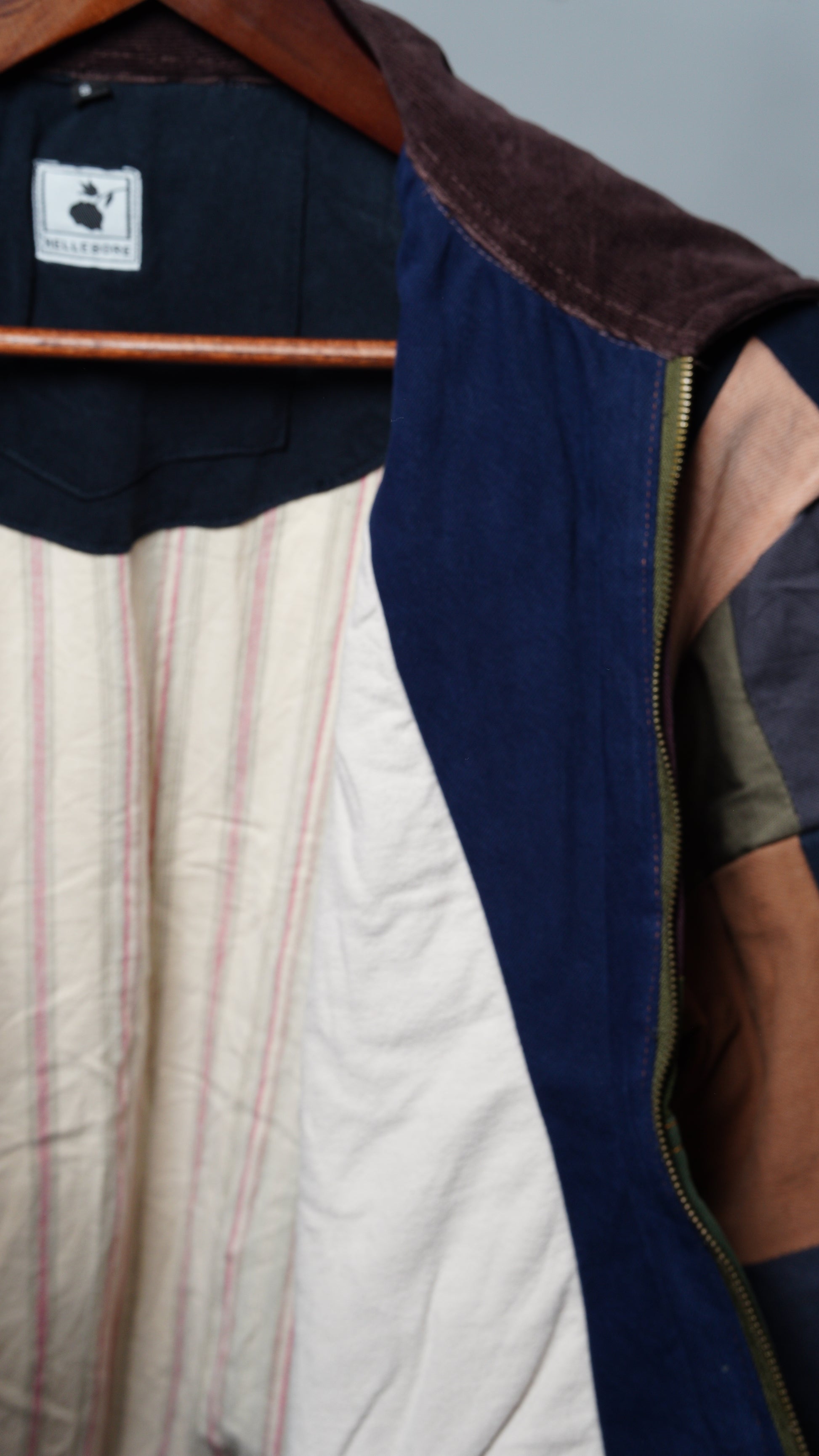 These jackets are made from soft work apparel scraps and preowned garments. Each jacket is unique with various color combinations and cloth linings. Linings and trims are taken from other second-hand materials and brands.