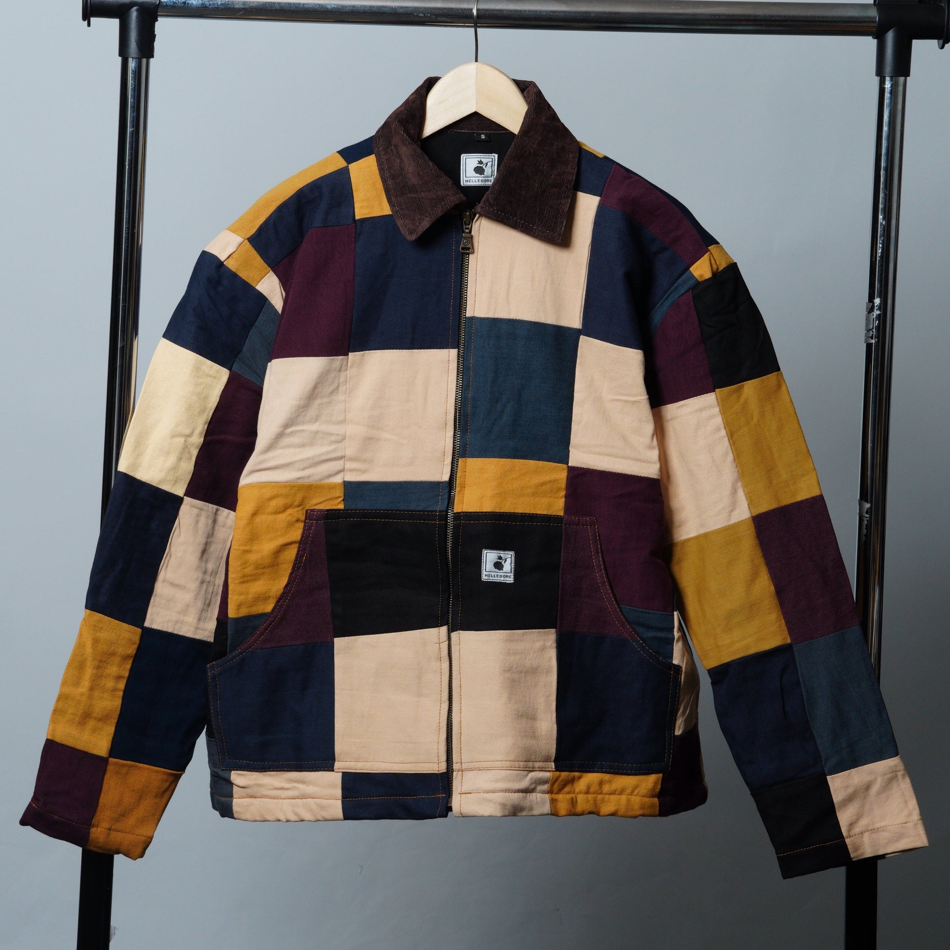 These jackets are made from rag-house sourced work apparel scraps and preowned garments. Each jacket is unique with various color combinations and cloth linings. Linings and trims are taken from other second-hand materials and brands.