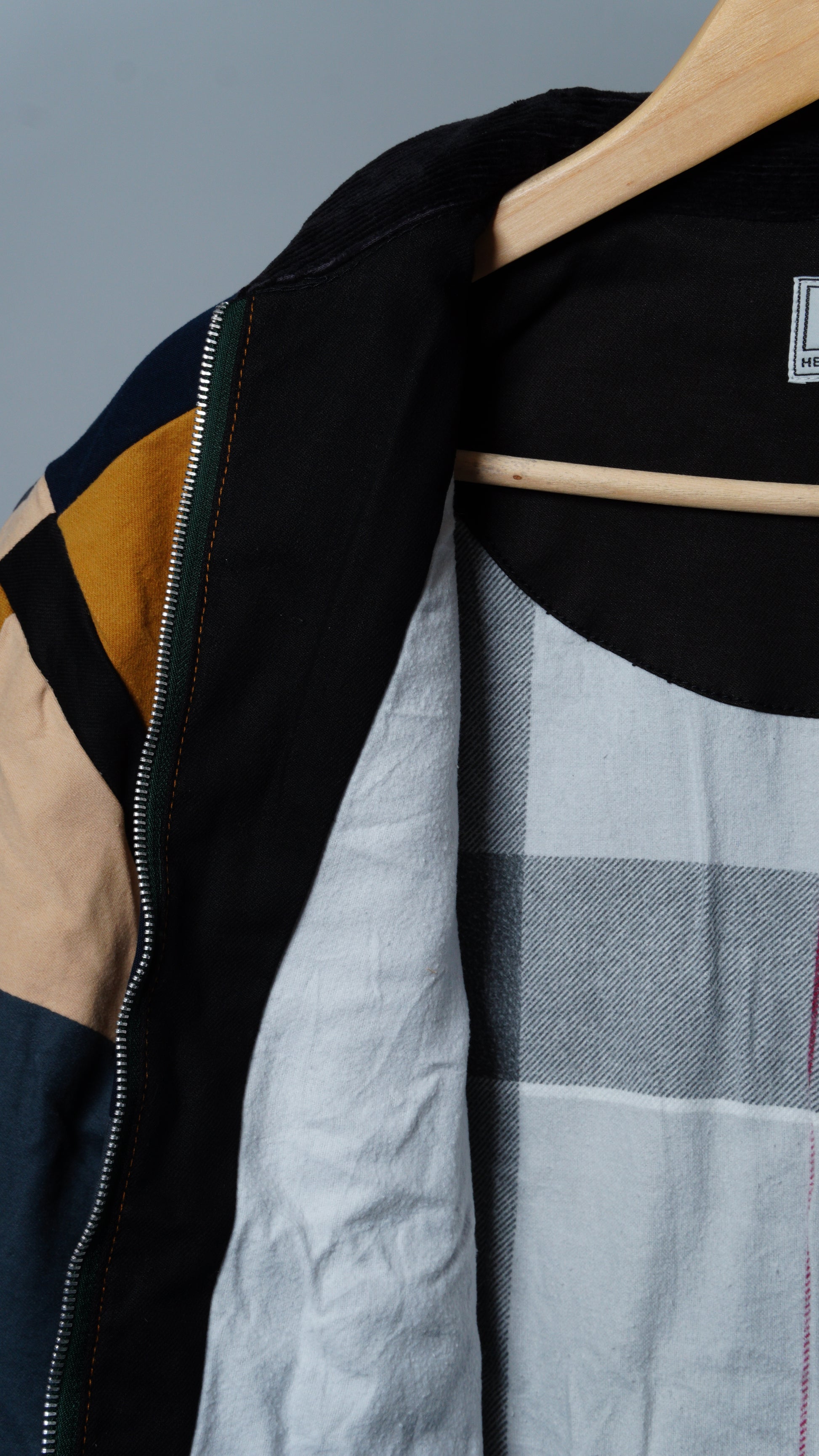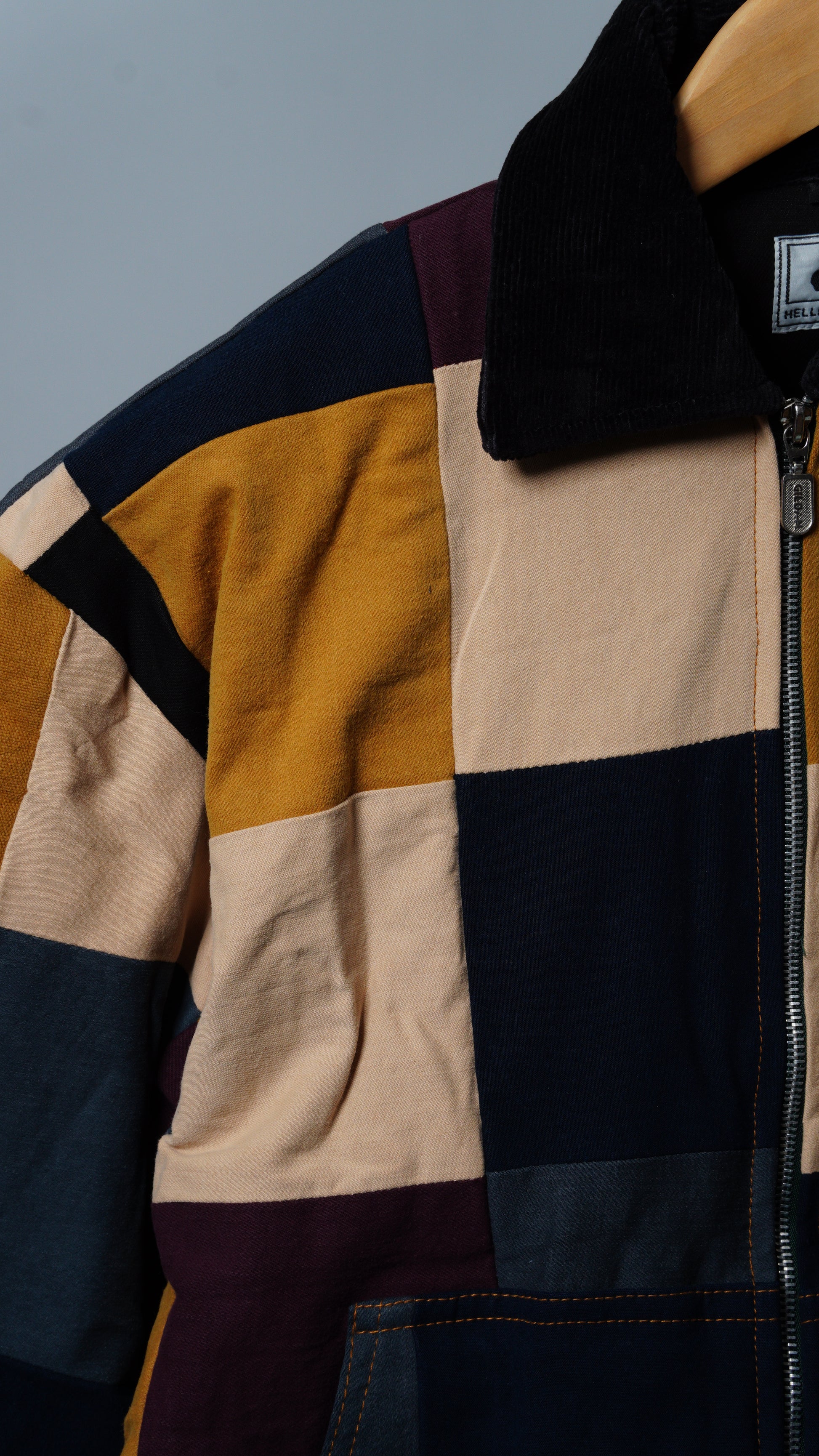 These jackets are made from soft work apparel scraps and preowned garments. Each jacket is unique with various color combinations and cloth linings. Linings and trims are taken from other second-hand materials and brands.