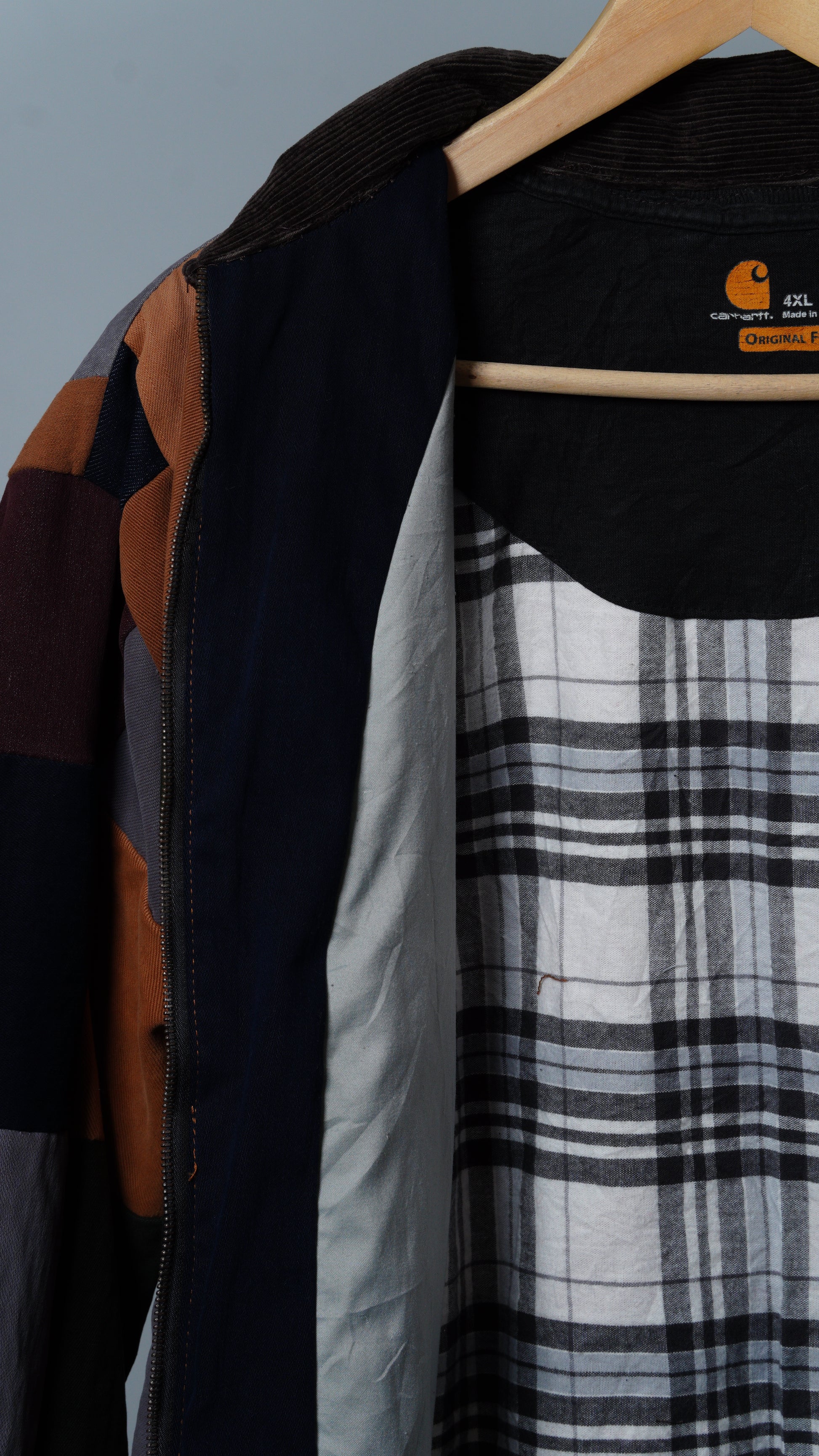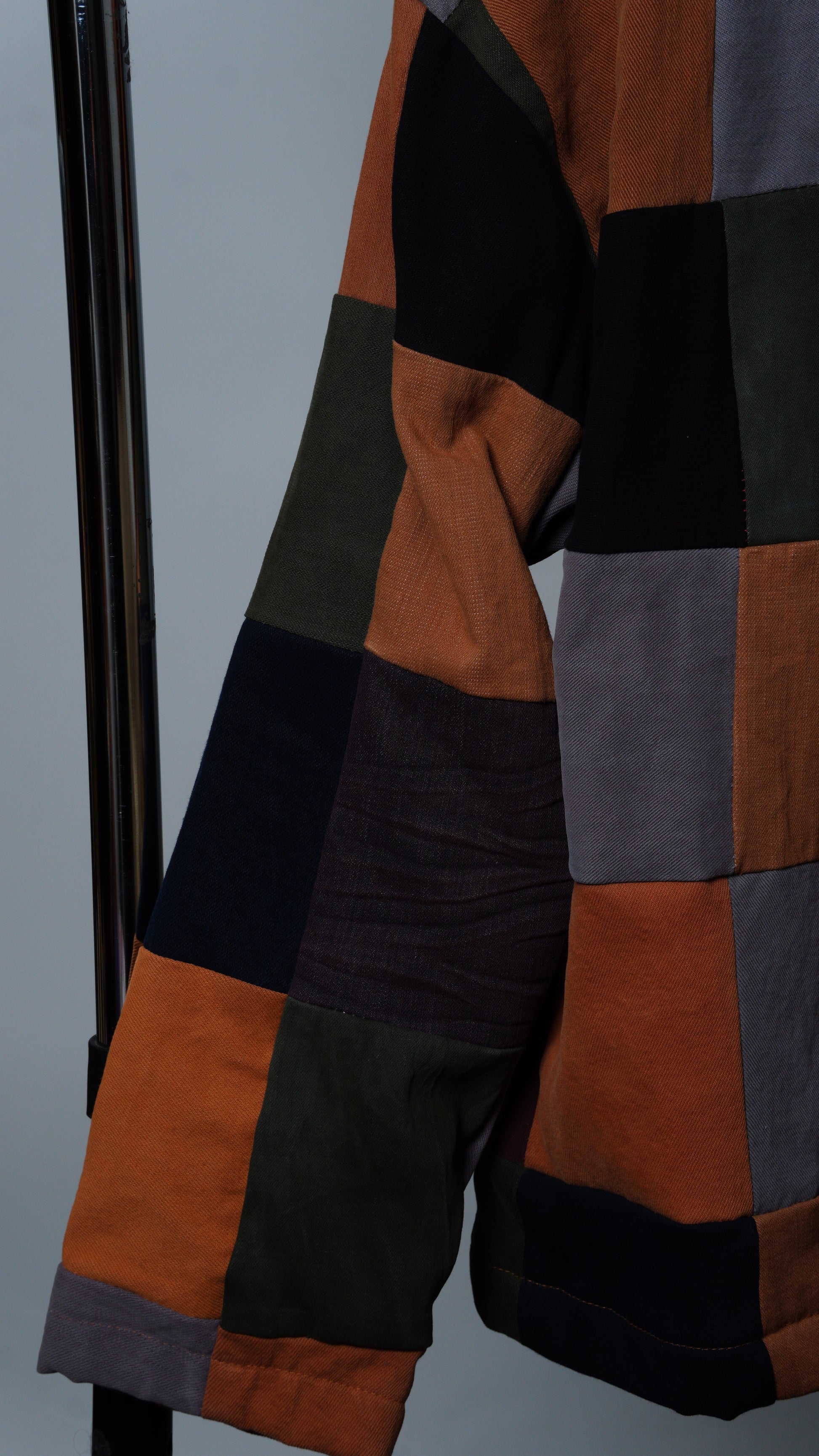 These jackets are made from soft work apparel scraps and preowned garments. Each jacket is unique with various color combinations and cloth linings. Linings and trims are taken from other second-hand materials and brands.
