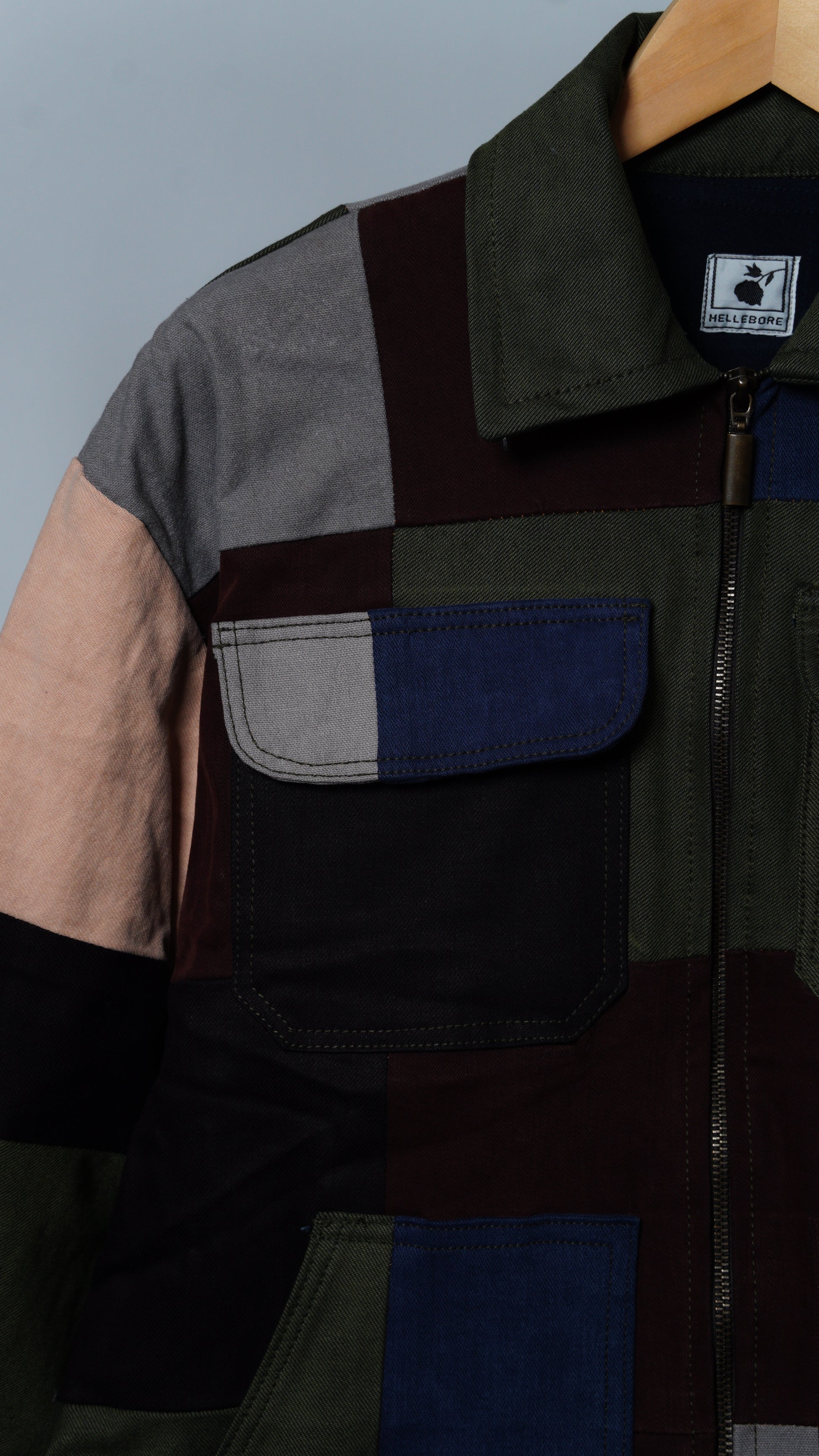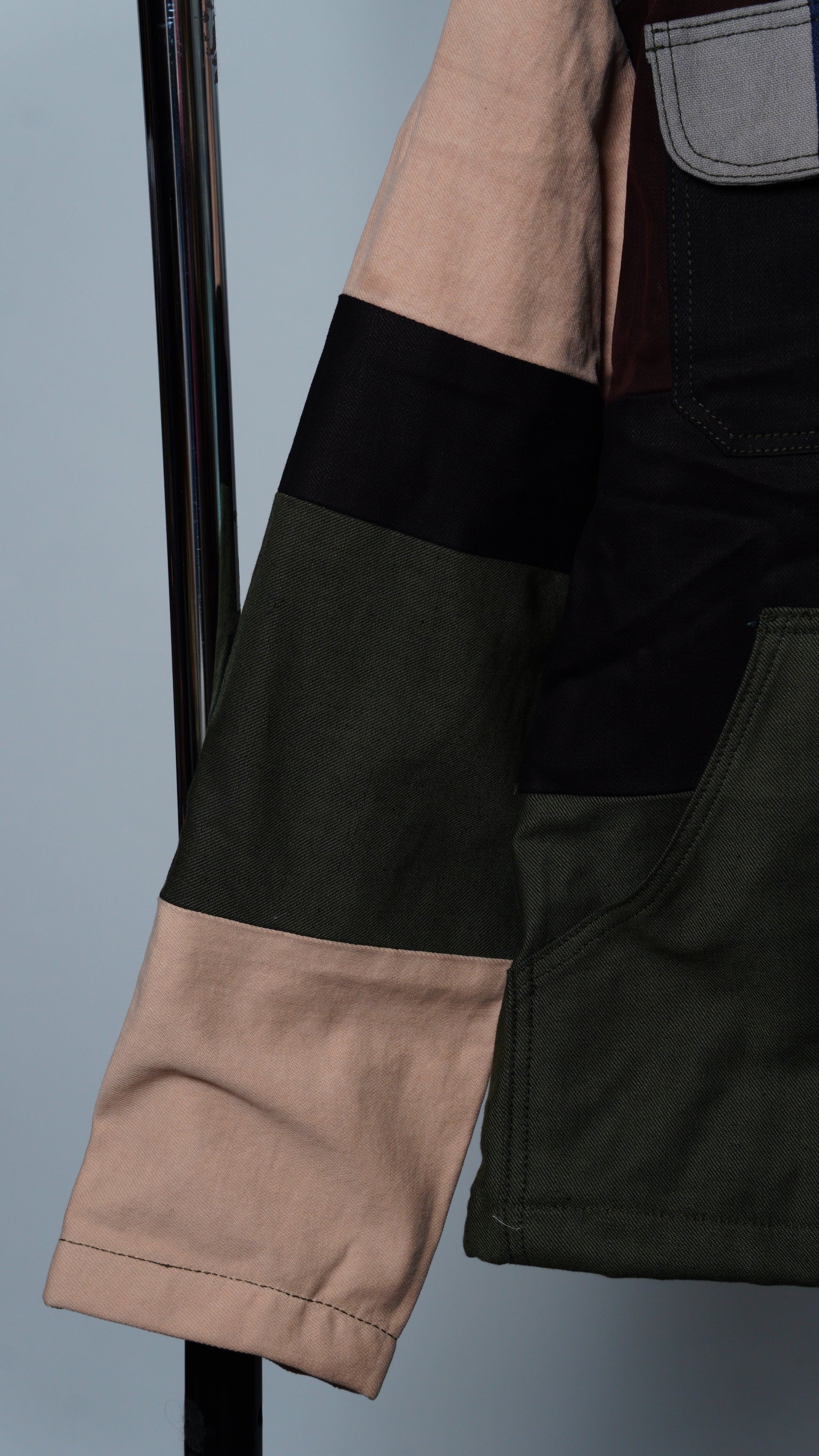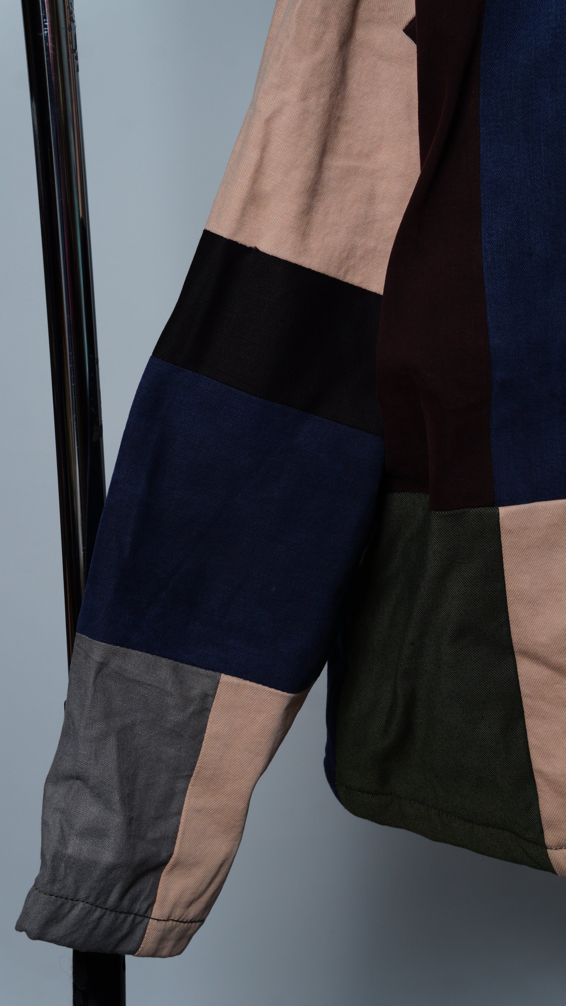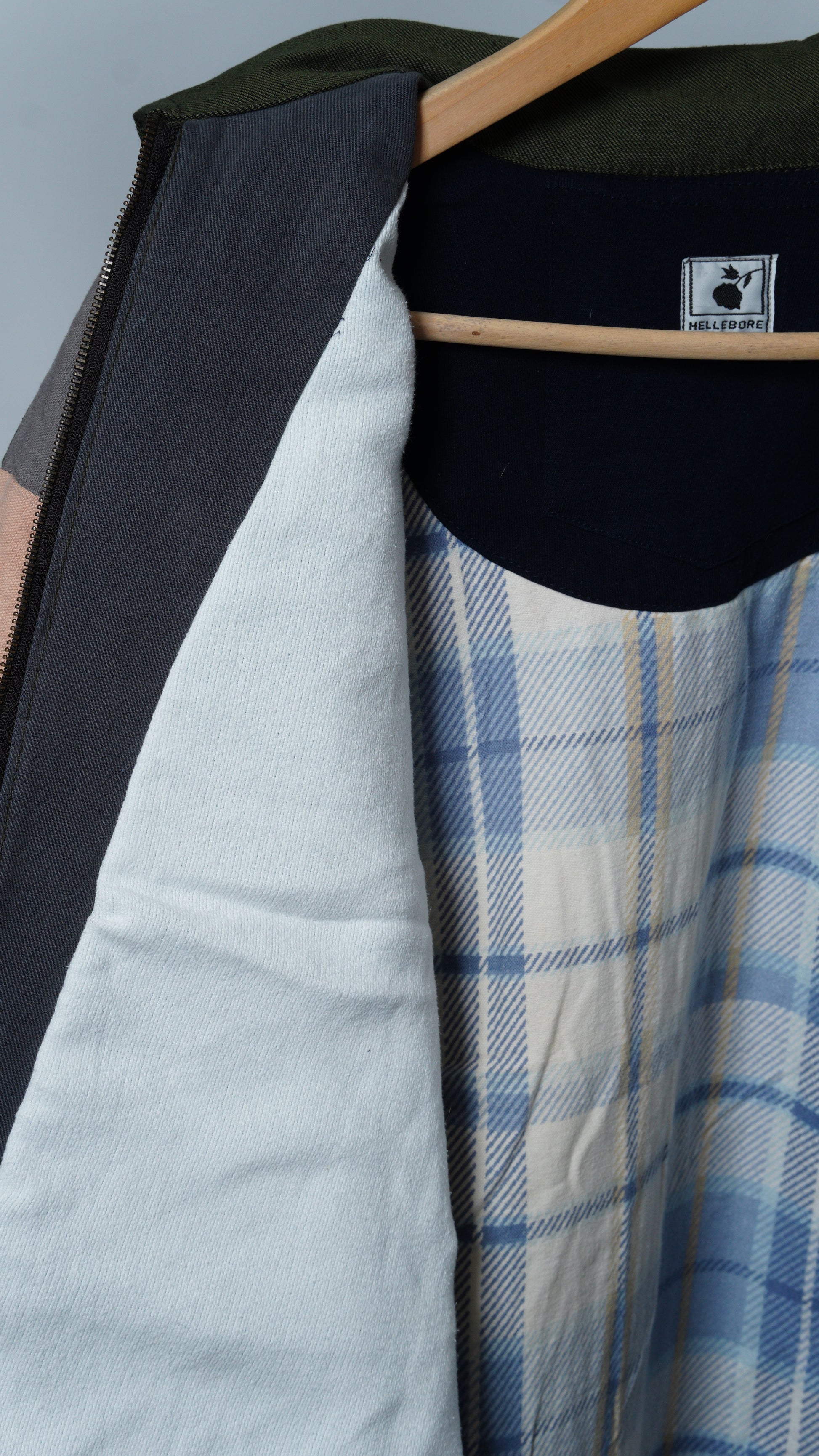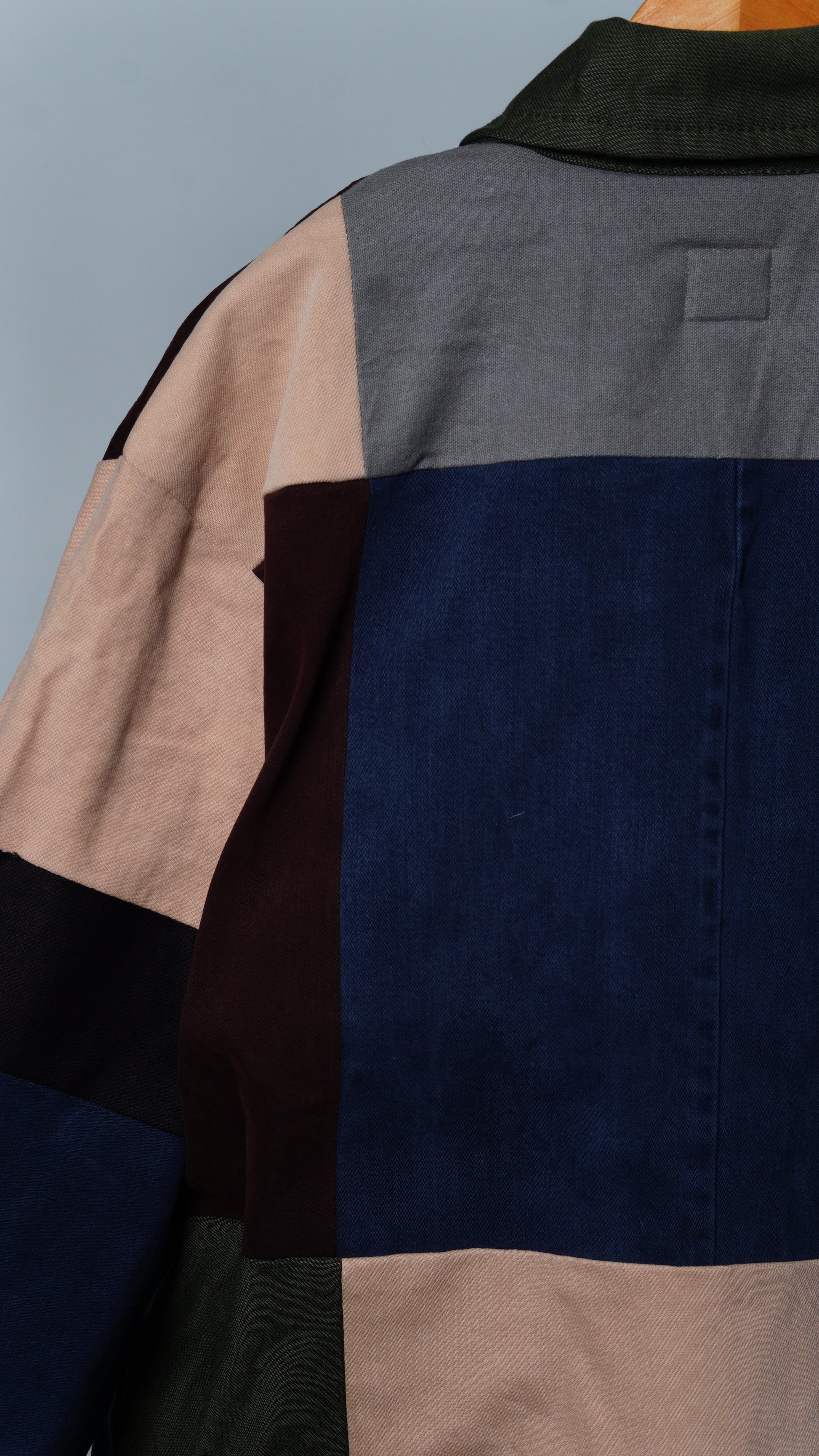 These jackets are made from soft work apparel scraps and preowned garments. Each jacket is unique with various color combinations and cloth linings. Linings and trims are taken from other second-hand materials and brands.