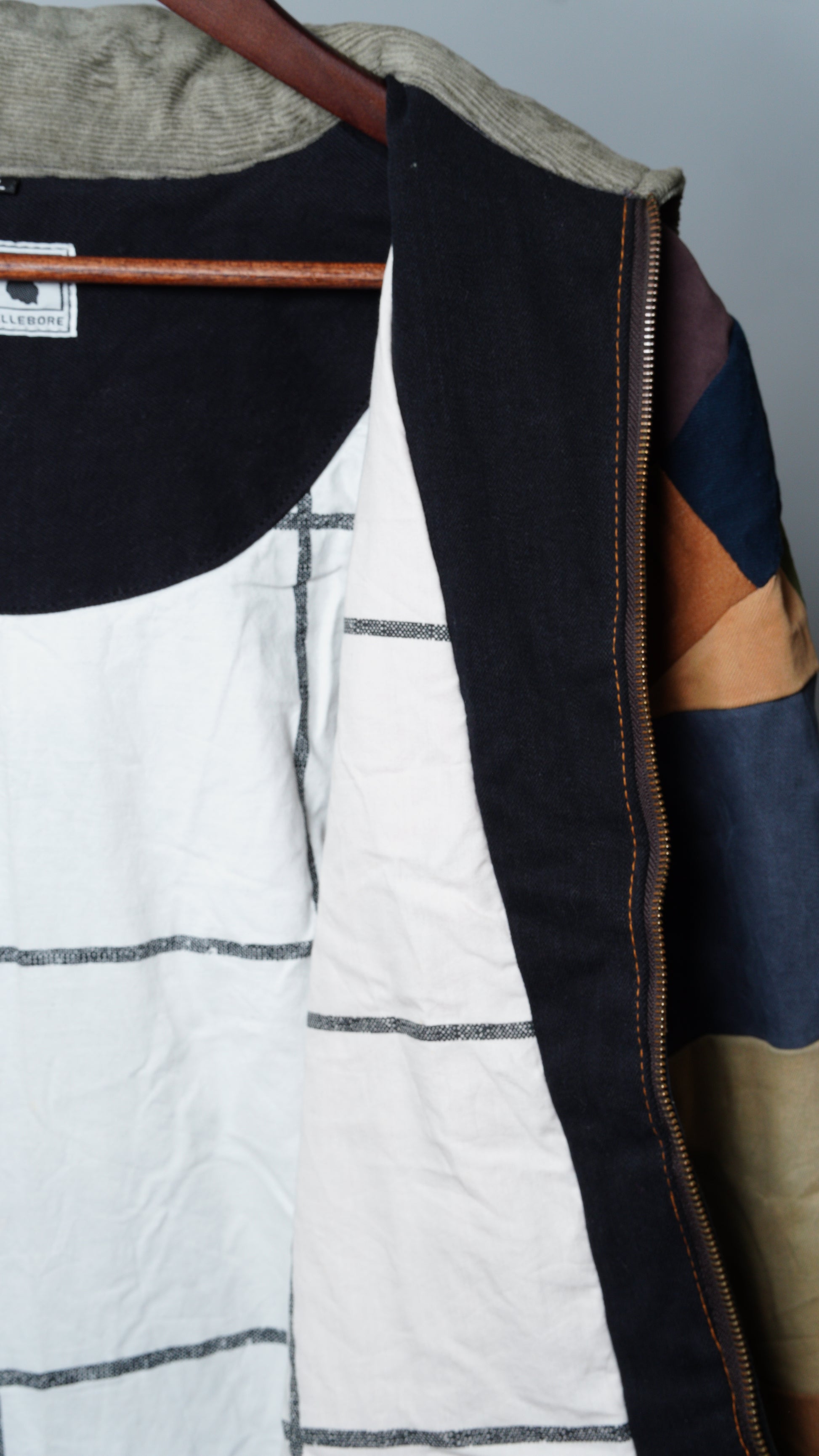 These jackets are made from soft work apparel scraps and preowned garments. Each jacket is unique with various color combinations and cloth linings. Linings and trims are taken from other second-hand materials and brands.