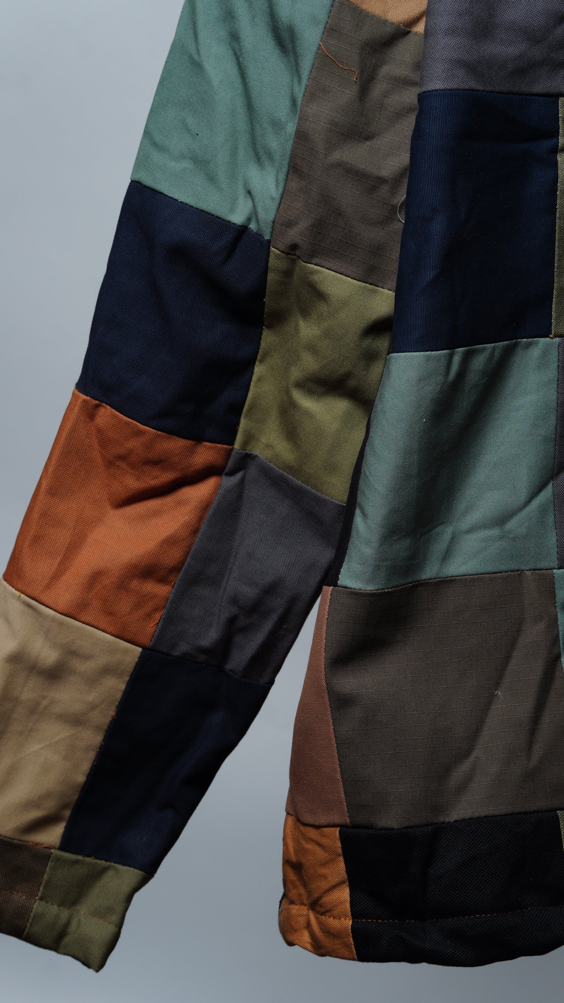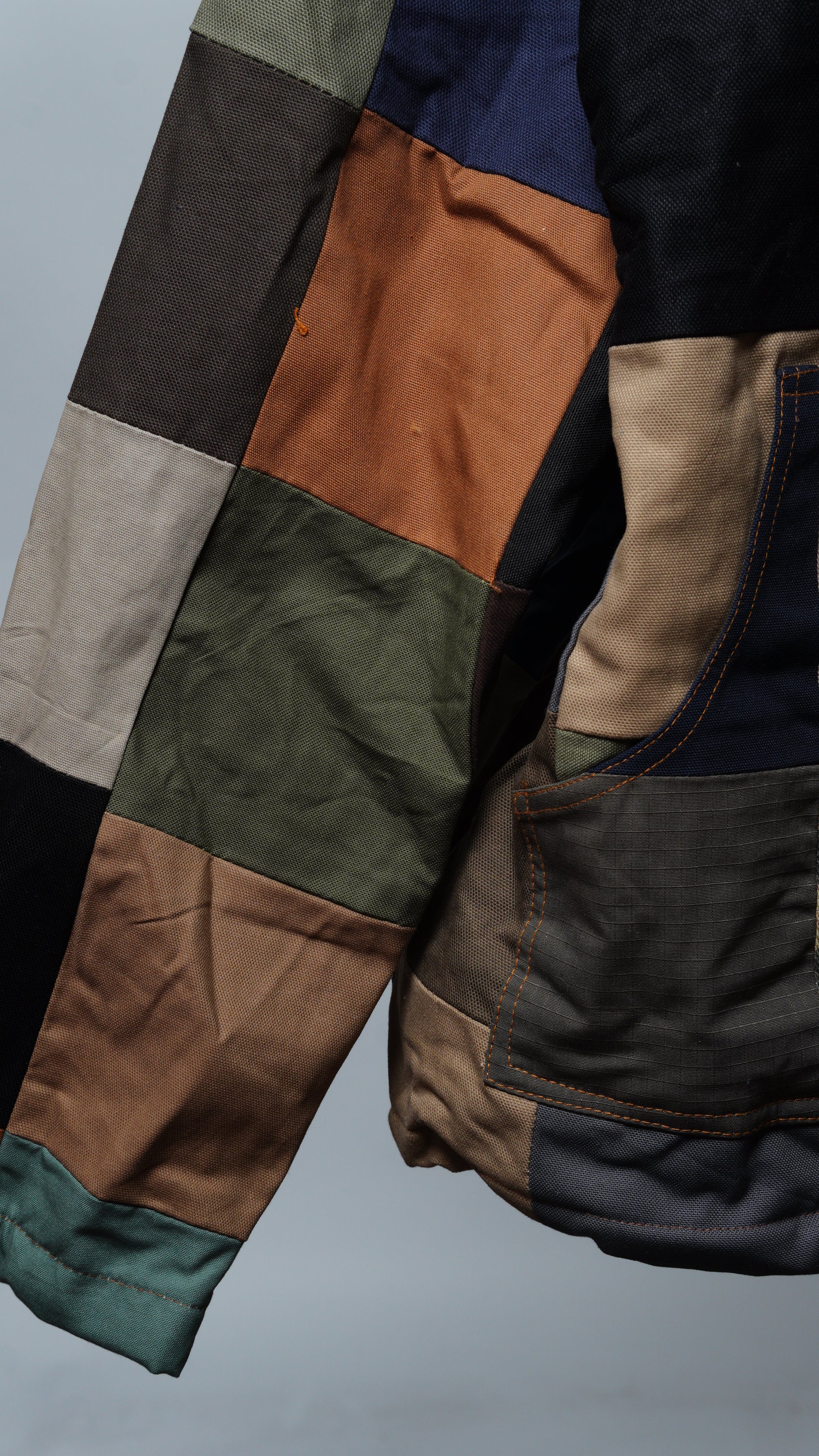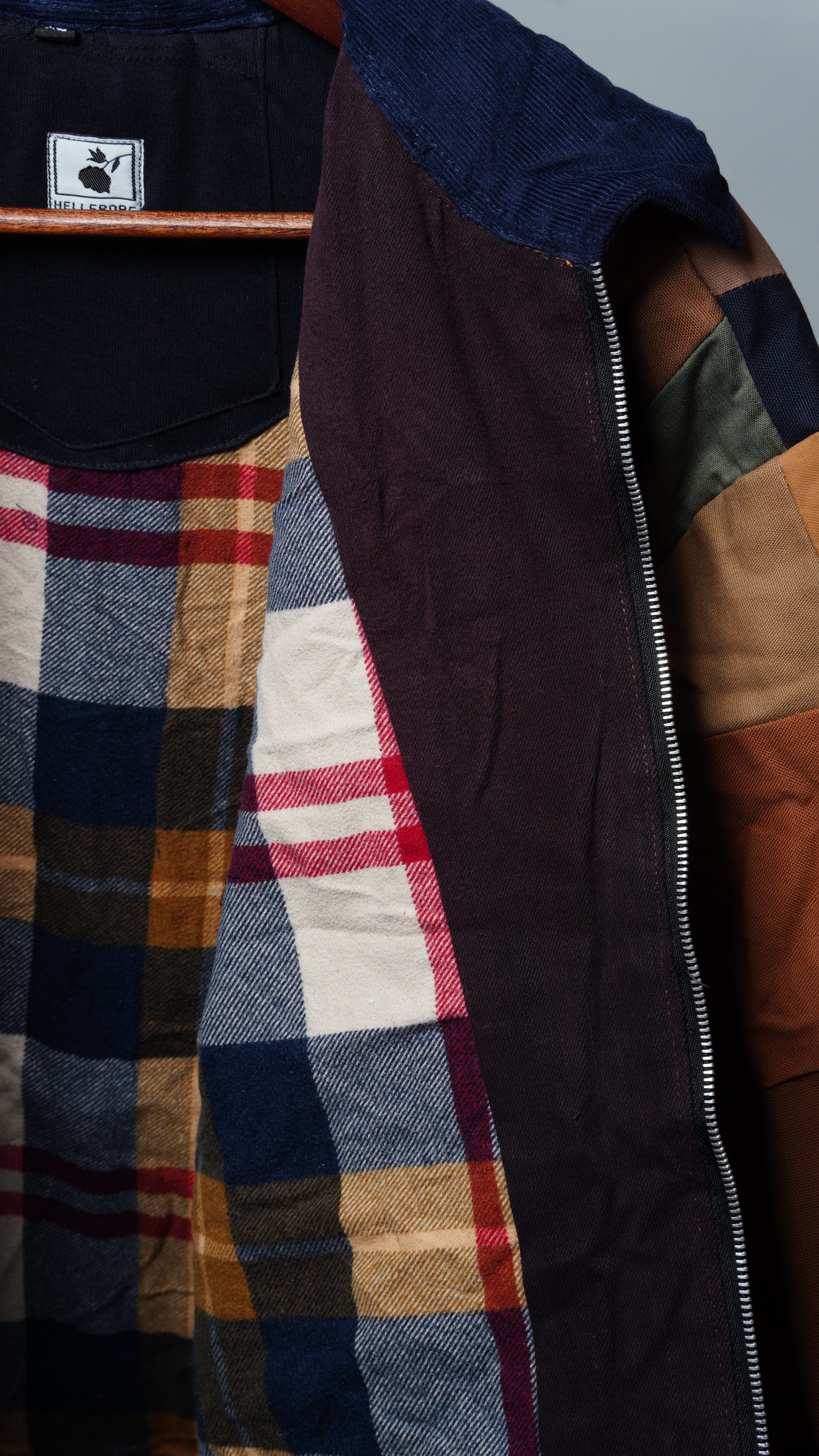 These jackets are made from soft work apparel scraps and preowned garments. Each jacket is unique with various color combinations and cloth linings. Linings and trims are taken from other second-hand materials and brands.