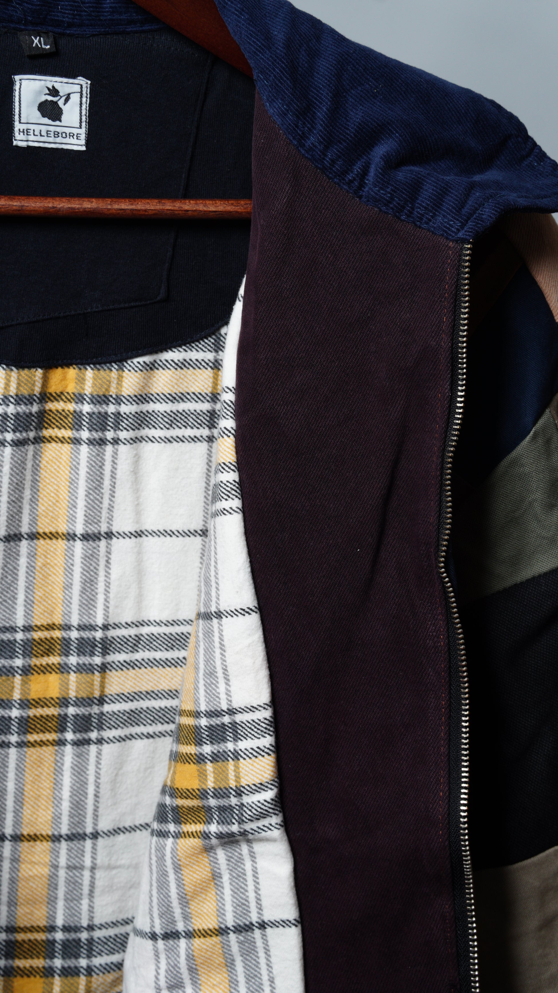 These jackets are made from soft work apparel scraps and preowned garments. Each jacket is unique with various color combinations and cloth linings. Linings and trims are taken from other second-hand materials and brands.