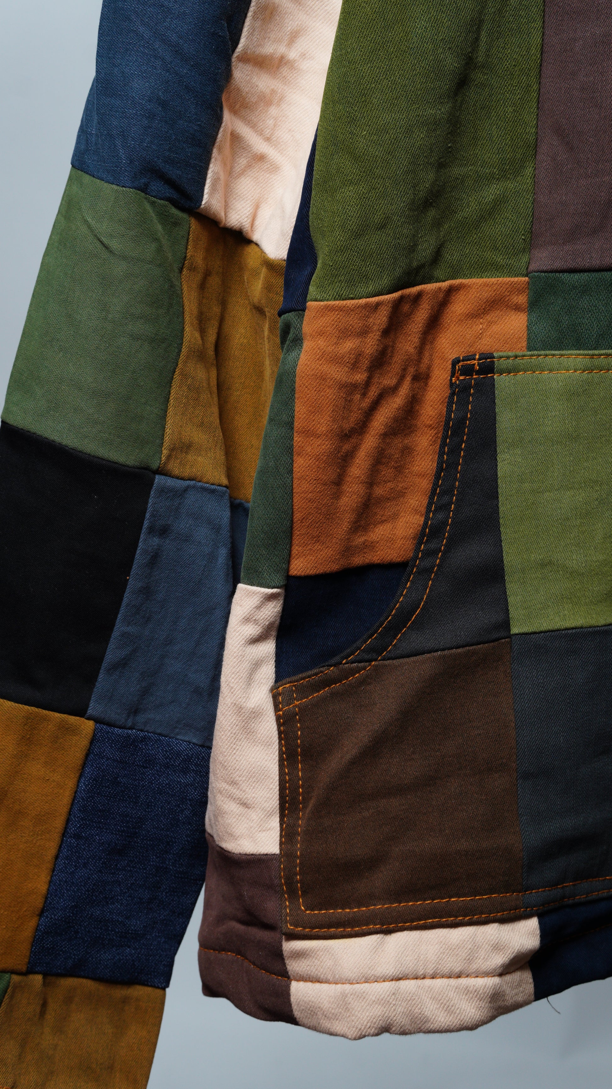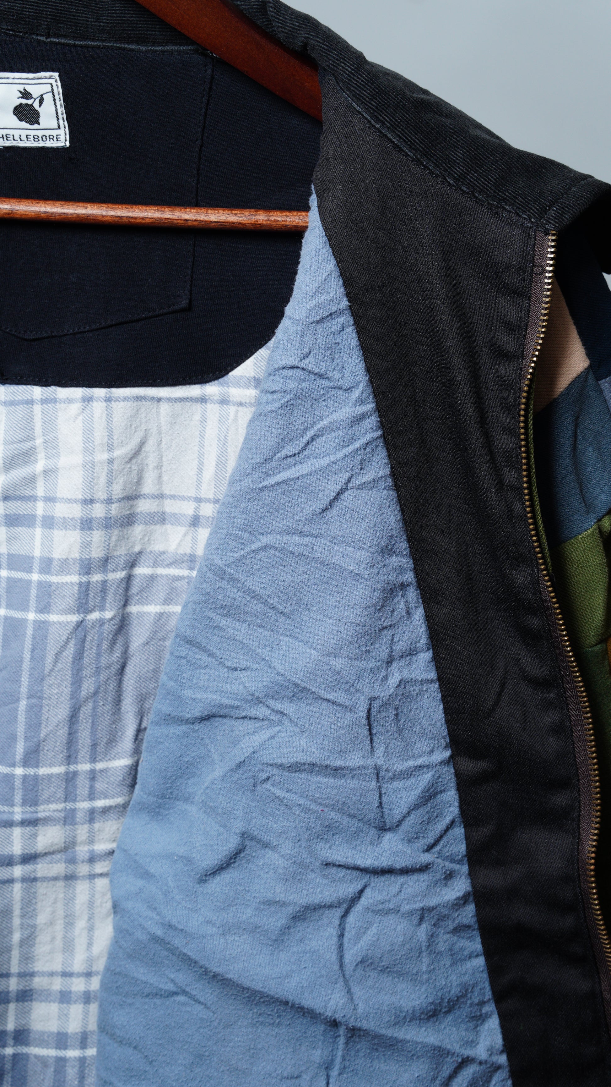 These jackets are made from soft work apparel scraps and preowned garments. Each jacket is unique with various color combinations and cloth linings. Linings and trims are taken from other second-hand materials and brands.