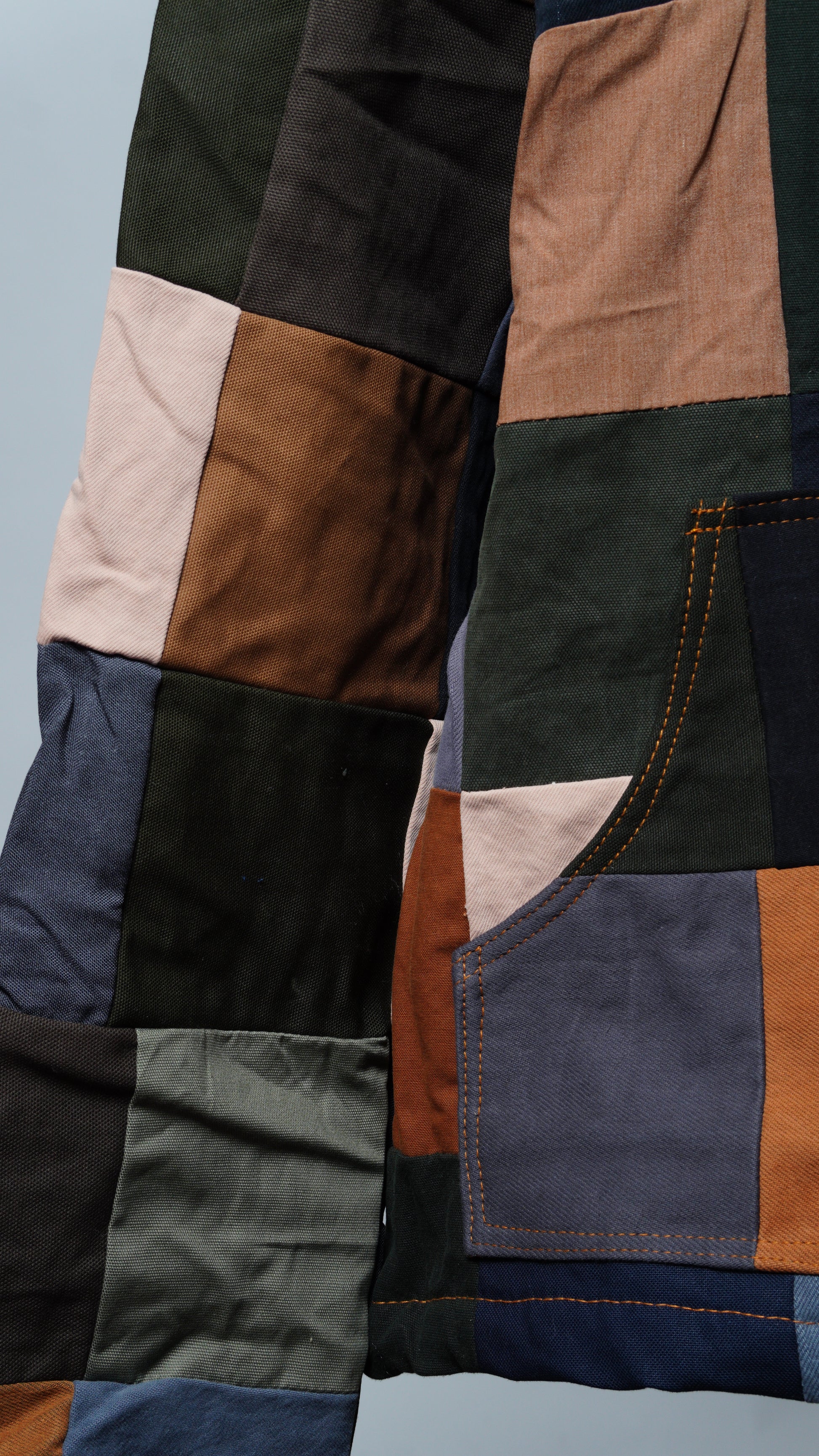 These jackets are made from soft work apparel scraps and preowned garments. Each jacket is unique with various color combinations and cloth linings. Linings and trims are taken from other second-hand materials and brands.