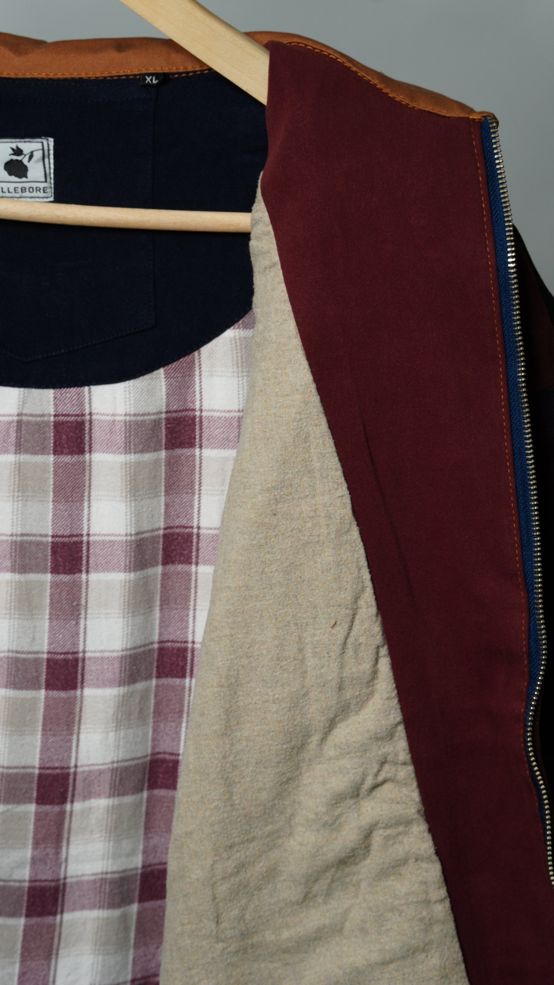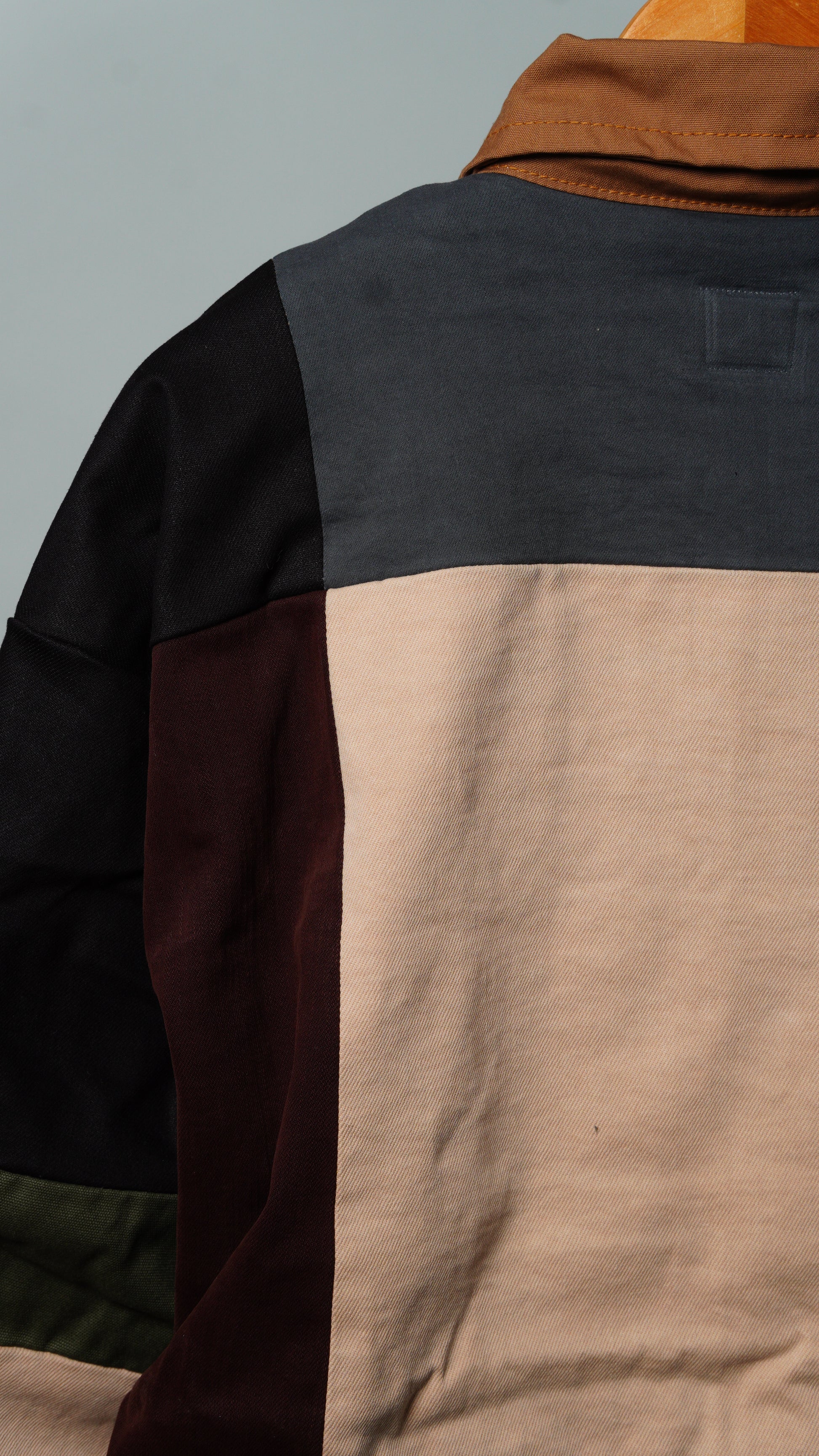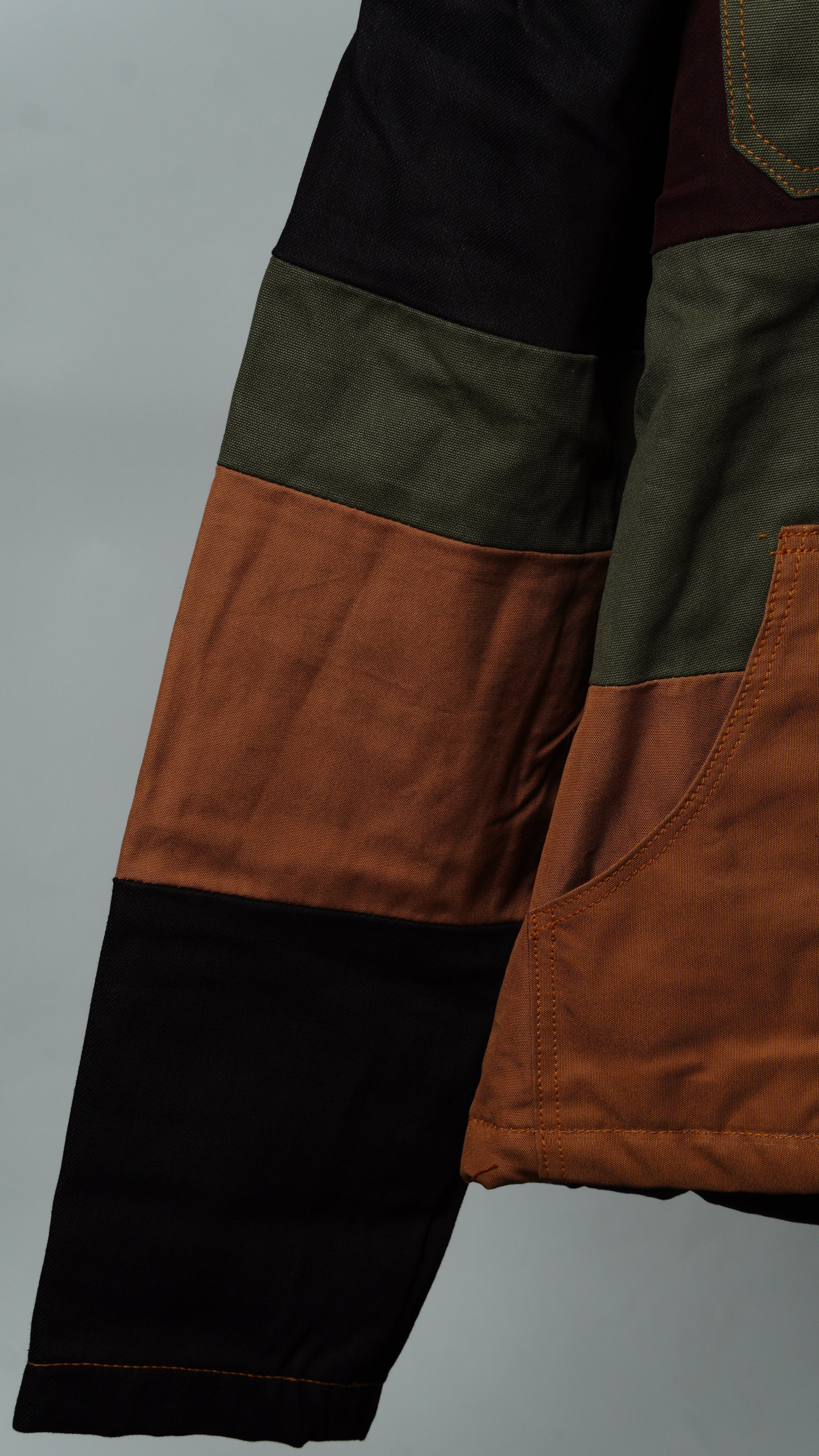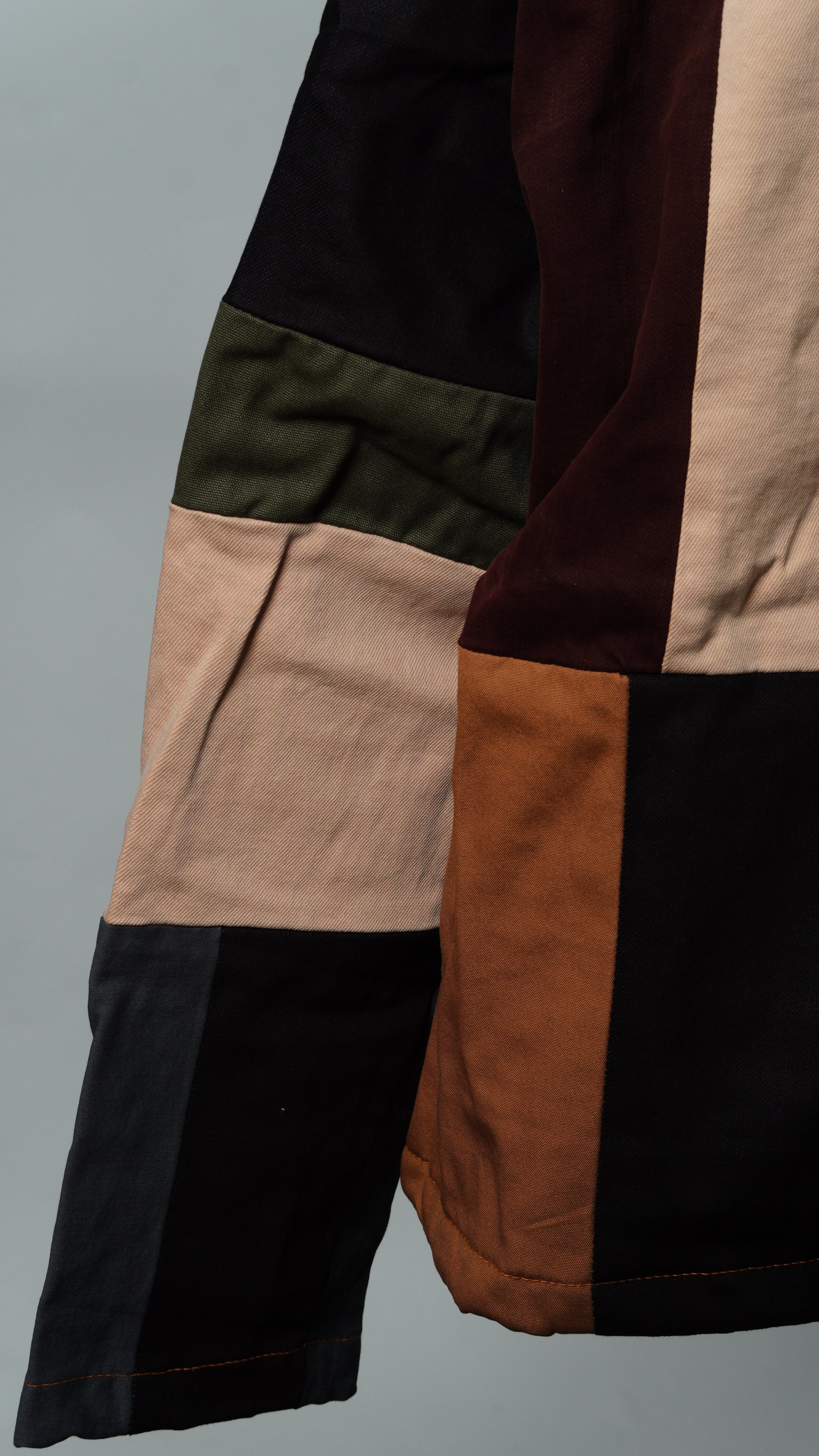These jackets are made from soft work apparel scraps and preowned garments. Each jacket is unique with various color combinations and cloth linings. Linings and trims are taken from other second-hand materials and brands.
