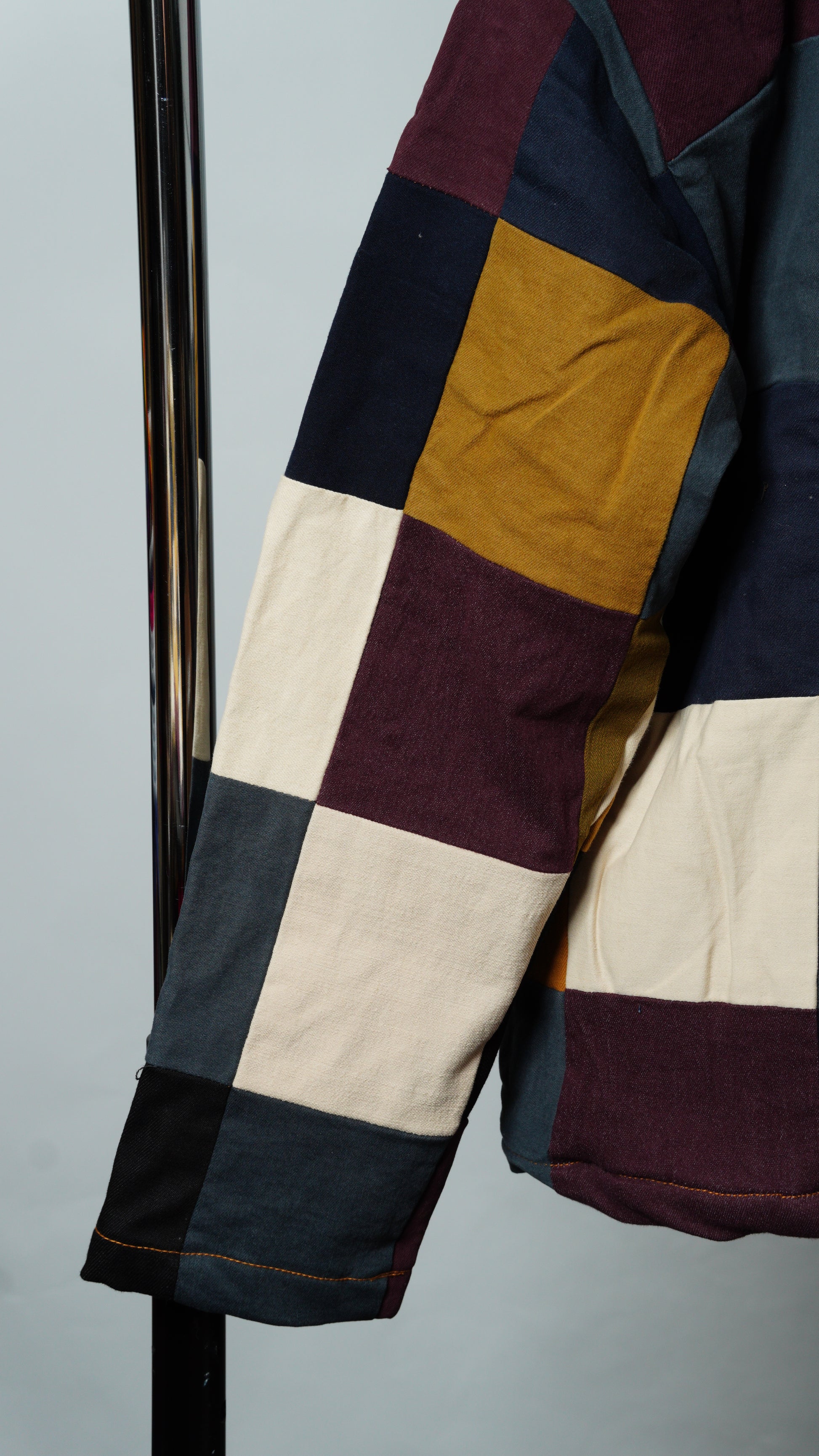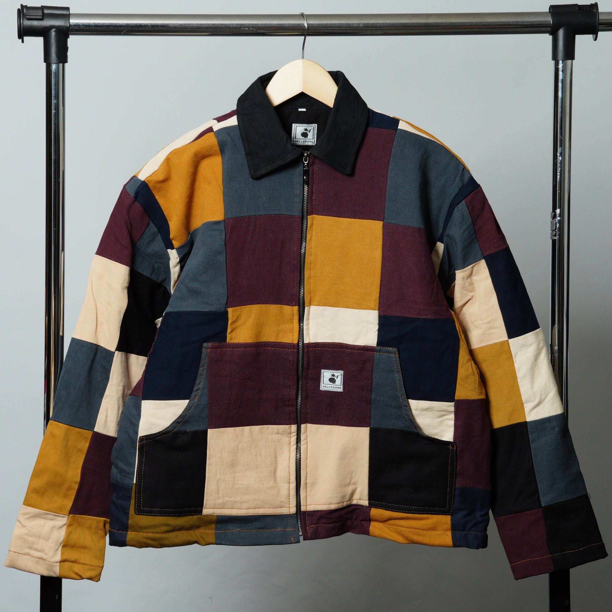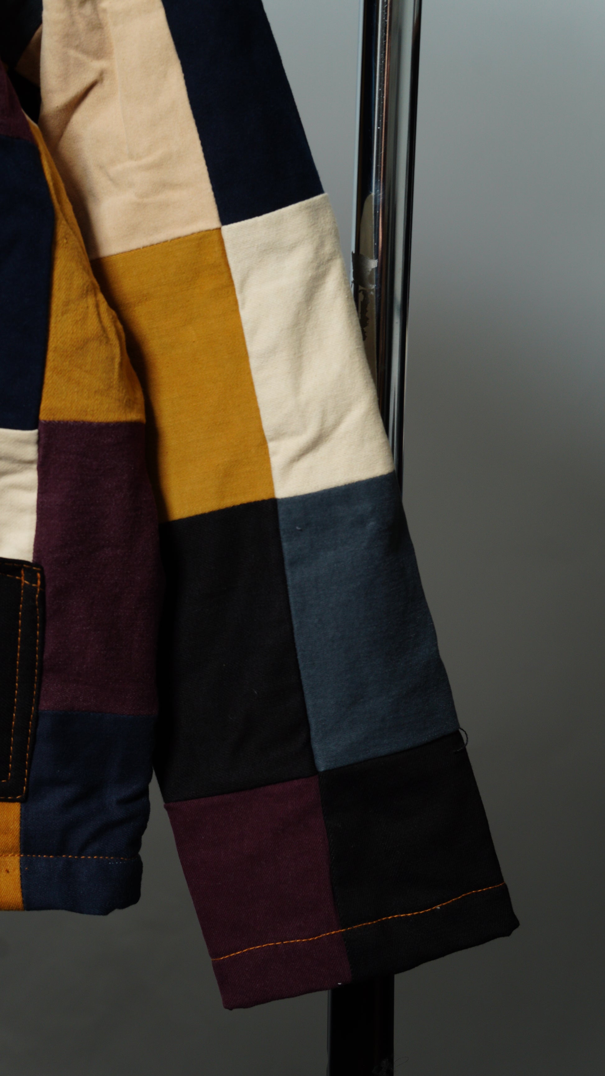 These jackets are made from rag-house sourced work apparel scraps and preowned garments. Each jacket is unique with various color combinations and cloth linings. Linings and trims are taken from other second-hand materials and brands.