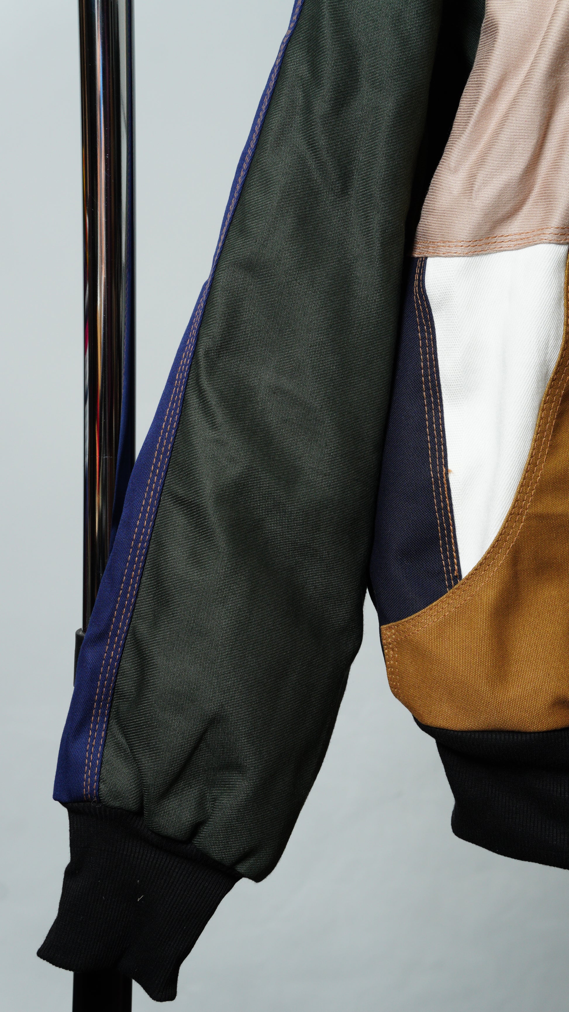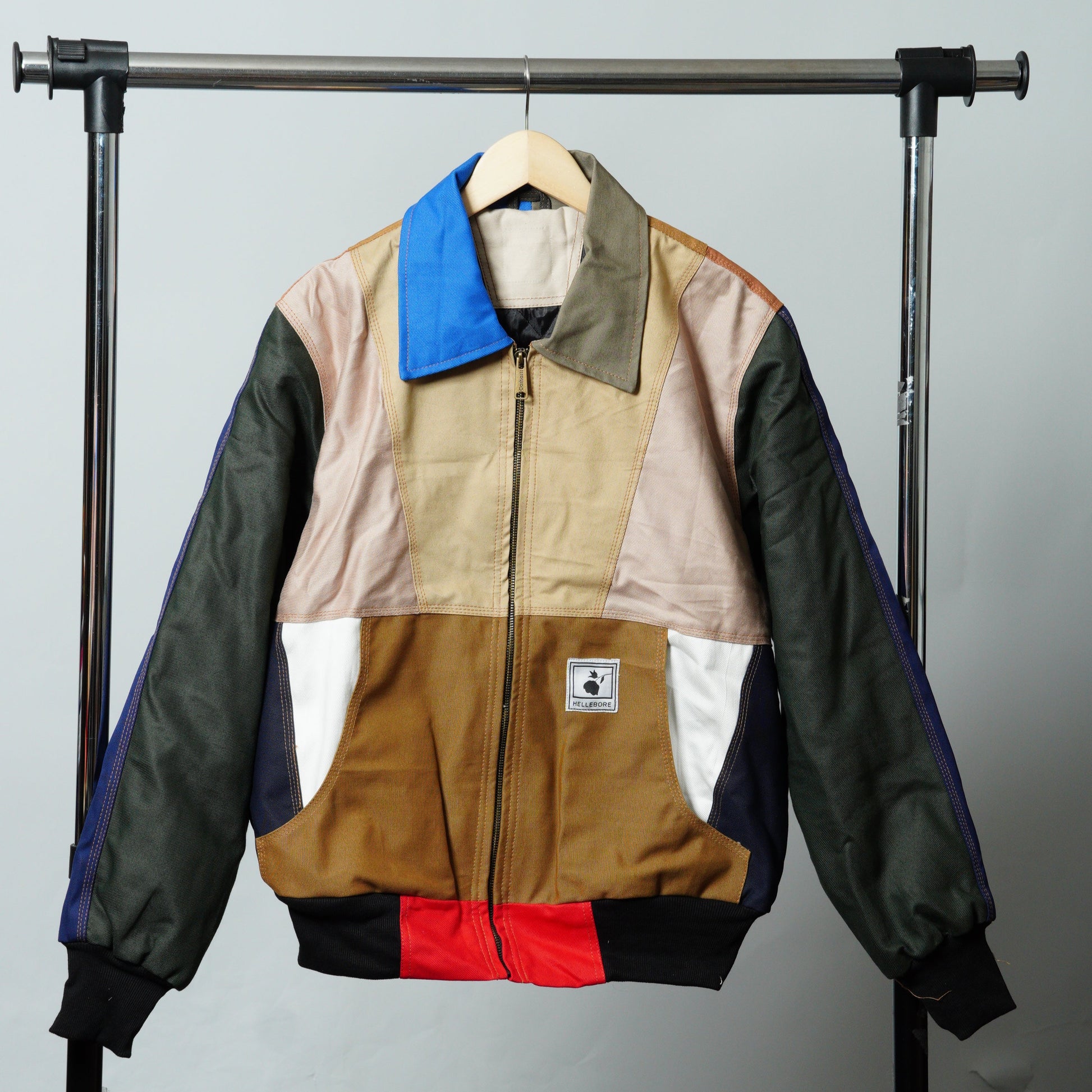These jackets are made from rag-house-sourced work apparel scraps, built with hardy cotton and a structured fit. Each jacket is unique with various color combinations and cloth linings.